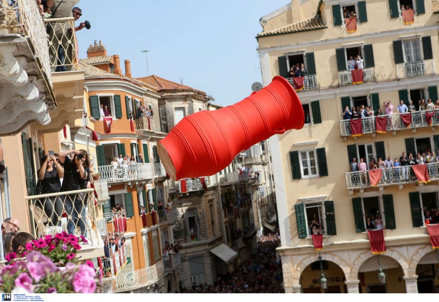 Στην Κέρκυρα, η Αναστάσιμη Ακολουθία τελείται στο πάλκο της Πάνω Πλατείας. Η πομπή έρχεται από τη γειτονική εκκλησία της Αγίας Παρασκευής, με τη συμμετοχή του Μητροπολίτη, των Αρχών, των Φιλαρμονικών και χιλιάδων κόσμου. Φαντασμαγορικό και μοναδικό θέαμα, όλα τα παράθυρα και τα μπαλκόνια των γύρω εξαόροφων σπιτιών ανοιχτά με κεράκια αναμμένα, ενώ σύνθεση μεγαλειώδους εικόνας είναι η πλατεία φωτισμένη από τις χιλιάδες λαμπάδες των πιστών, που παρακολουθούν την τελετή της Αναστάσεως στη μεγαλύτερη πλατεία της Ελλάδας. Η Ανάσταση γίνεται με τυμπανοκρουσίες, βεγγαλικά και πυροτεχνήματα. Οι μπάντες, μόλις τελειώσει η Ανάσταση, τριγυρνούν την πόλη παίζοντας εύθυμα εμβατήρια και ο κόσμος τρέχει ξοπίσω τους τραγουδώντας. Το γλέντι έχει μόλις αρχίσει και θα διαρκέσει μέχρι το πρωί, με τσιλίχουρδα (τοπική μαγειρίτσα), κόκκινα αυγά, φογάτσες, κολομπίνες (βενετσιάνικης προέλευσης χριστόψωμα σε σχήμα περιστεριού) και πολύ κρασί. Από τις 7 το πρωί κάθε εκκλησία, όπως συμβαίνει και με τους Επιταφίους, κάνει περιφορά της Ανάστασης στους κεντρικούς δρόμους της πόλης, με Φιλαρμονικές, σχολεία, προσκόπους, χορωδίες.