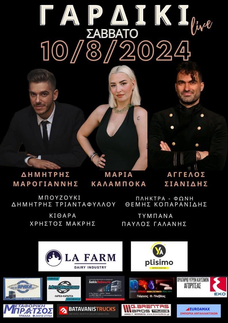Όλα είναι έτοιμα για ένα όμορφο βράδυ με λαϊκό πρόγραμμα στο ξακουστό Γαρδίκι το Σάββατο 10 Αυγούστου . Με τους Δημήτρη Μαρογιάννη, Μαρία Καλαμπόκα, και Άγγελο Σιανίδη.