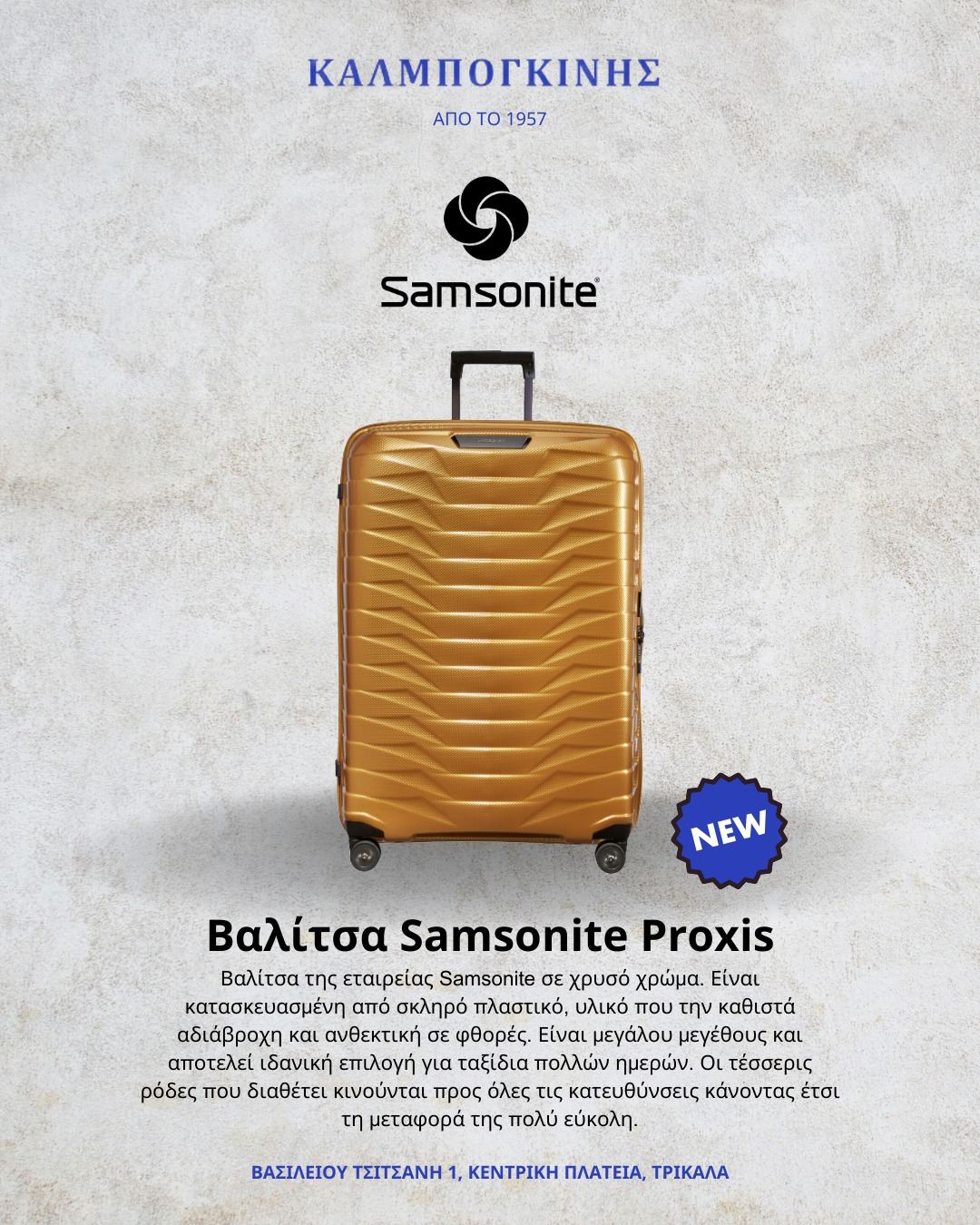Ανακαλύψτε μια νέα εποχή ταξιδιού υψηλής ποιότητας με την Proxis. Το εξωτερικό κέλυφος είναι κατασκευασμένο από Roxkin ™, ένα αποκλειστικό πολυεπίπεδο υλικό που αναπτύχθηκε από την Samsonite. Επαναφέρει το αρχικό της σχήμα, διαθέτει αξιοσημείωτη δύναμη, ανθεκτικότητα και ελαφρότητα. Ο εκλεπτυσμένος σχεδιασμός της Proxis αποπνέει σιγουριά και ο πλήρης εξοπλισμός της θα καλύψει όλες τις ταξιδιωτικές σας ανάγκες.
