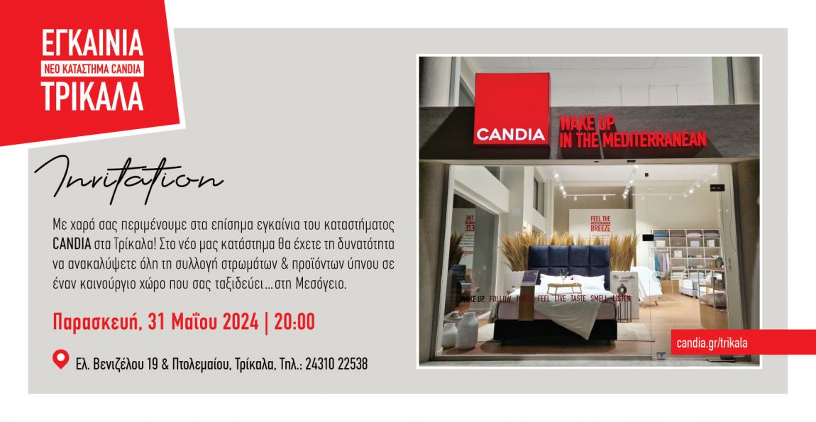 Η εταιρεία Candia Strom σας προσκαλεί στα επίσημα εγκαίνια του καταστήματος στα Τρίκαλα. Στο νέο κατάστημα θα έχετε τη δυνατότητα να ανακαλύψετε όλη τη συλλογή στρωμάτων & προϊόντων ύπνου σε έναν καινούργιο χώρο που σας ταξιδεύει στη Μεσόγειο.