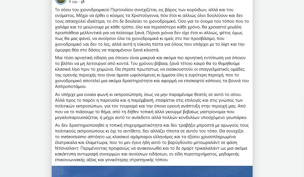 Στο σκηνικό αυτό, έχει ξεχωρίσει και μια επικριτική ανάρτηση στο Facebook, η οποία αναφέρει με καυστικό τρόπο την ανάγκη για μια πιο ενεργή και πραγματική στήριξη της τοπικής επιχειρηματικότητας και την απογοήτευση από τα επικοινωνιακά πυροτεχνήματα, όπως το “Μετεωραλάντ” το “Σμαρτ Τρικαλαλάντ” το Ελαμετέωρα και το Ελατρίκαλα Μπορεί να είναι εικόνα βουνοπλαγιά µε χιόνι και δέντρο