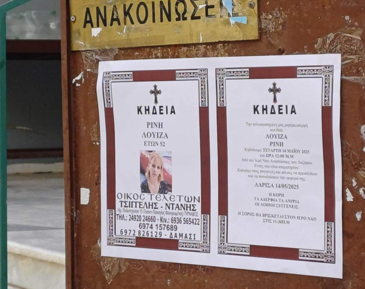 Βουβή θλίψη, πόνος και πολλά αναπάντητα ερωτήματα κυριάρχησαν το μεσημέρι της Τετάρτης στην εξόδιο ακολουθία της 52χρονης Λουίζας Ρίνη, η οποία έχασε τη ζωή της με φρικτό τρόπο, μαχαιρωμένη 25 φορές από τον 21χρονο γιο της, μέσα στο ίδιο της το σπίτι στη Λάρισα.