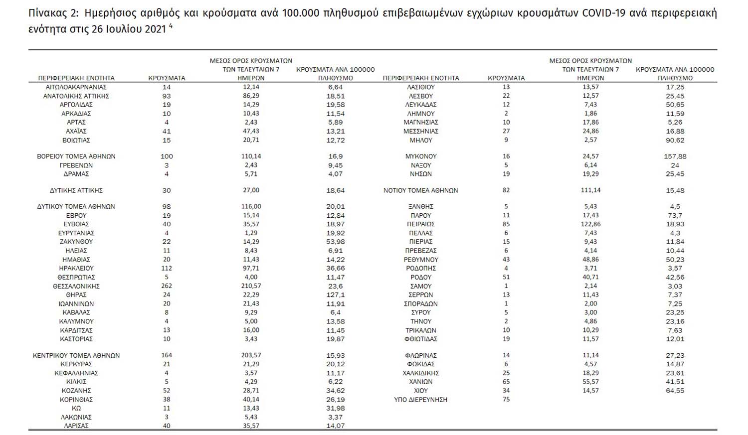 Σε όλη τη χώρα, με βάση τα δεδομένα που έχουν δηλωθεί στον ΕΟΔΥ και καταγραφεί μέχρι τις 26 Ιουλίου 2021 (ώρα 15:00), τα νέα εργαστηριακά επιβεβαιωμένα κρούσματα της νόσου που καταγράφηκαν τις τελευταίες 24 ώρες είναι 2.070 , εκ των οποίων 13 εντοπίστηκαν κατόπιν ελέγχων στις πύλες εισόδου της χώρας.