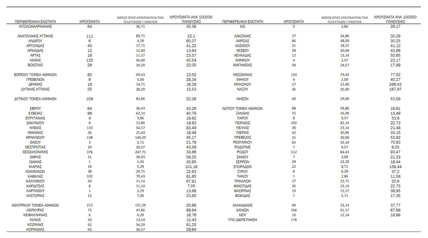 Ο συνολικός αριθμός των κρουσμάτων ανέρχεται σε 554.055 (ημερήσια μεταβολή +0.7%), εκ των οποίων 51.1% άνδρες. Με βάση τα επιβεβαιωμένα κρούσματα των τελευταίων 7 ημερών, 129 θεωρούνται σχετιζόμενα με ταξίδι από το εξωτερικό και 1.578 είναι σχετιζόμενα με ήδη γνωστό κρούσμα.