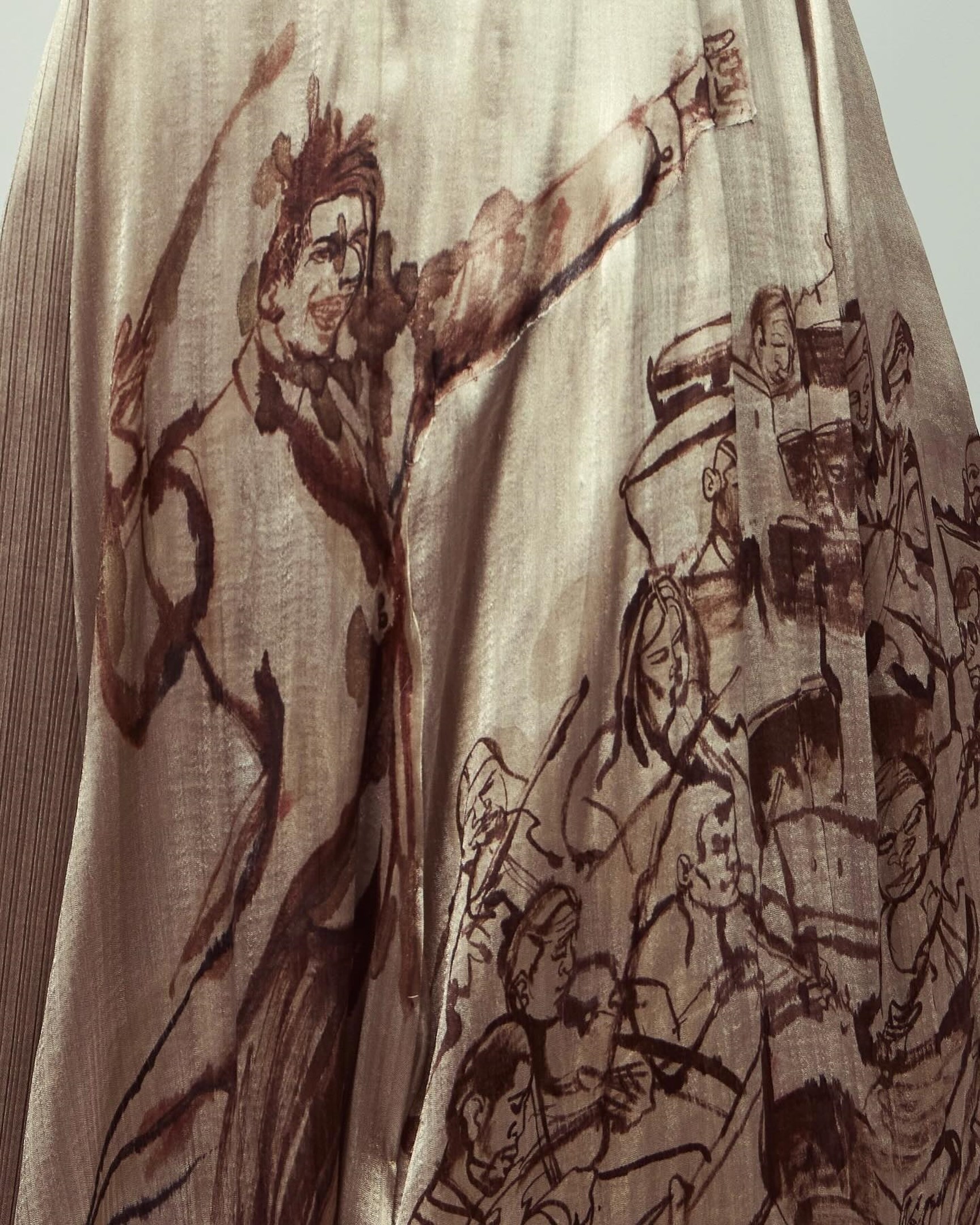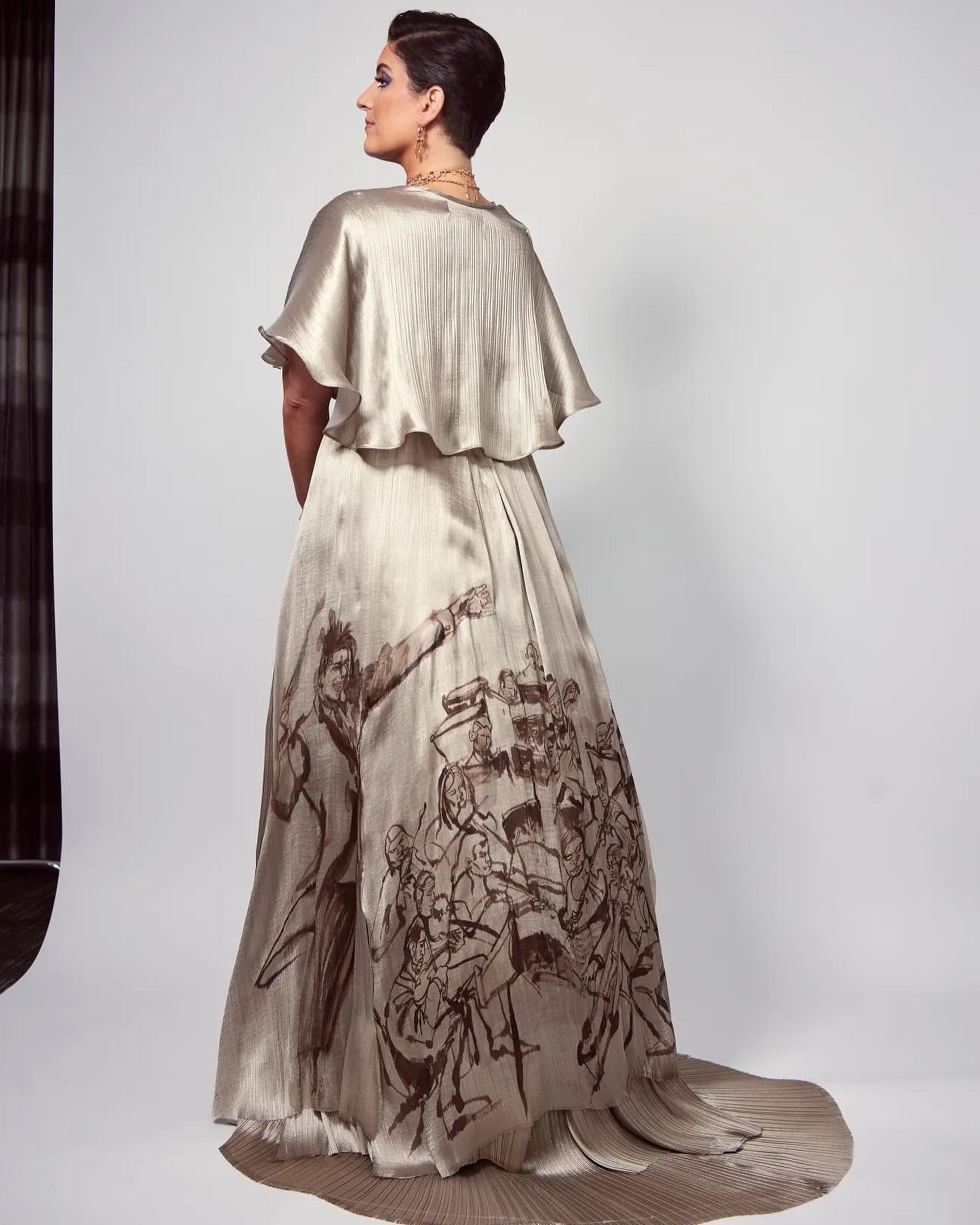 Το συγκεκριμένο φόρεμα είναι κατασκευασμένο από 100% βιώσιμο και vintage μετάξι και στο πίσω μέρος αποτυπώνεται ένα σκίτσο σχεδιασμένο στο χέρι. Δημιουργήθηκε σε συνεργασία με τον Αμερικανό καλλιτέχνη Τσαζ Γκεστ και αποτυπώνει τον Μπατίστ να διευθύνει μια ορχήστρα.