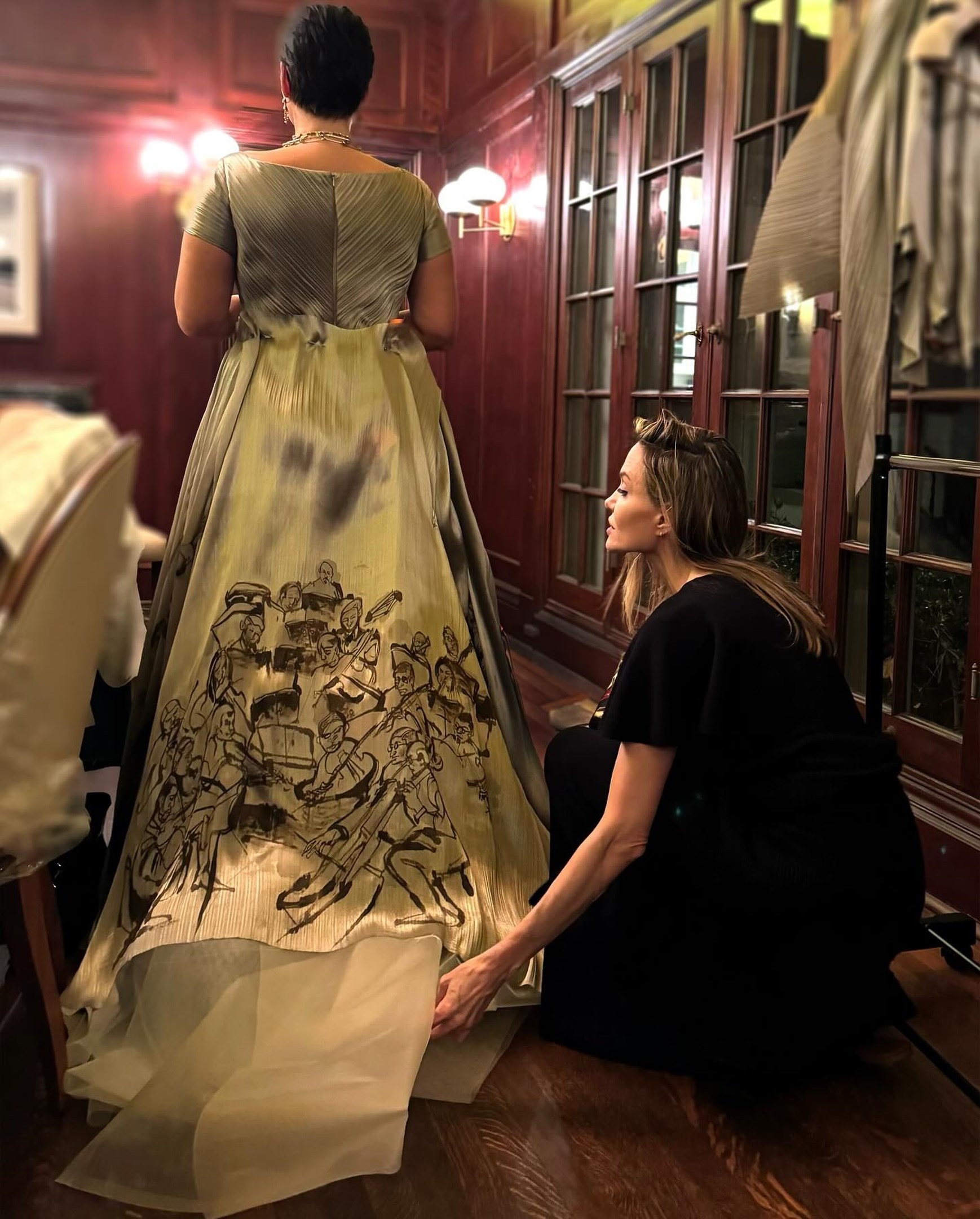 Σε μια από τις φωτογραφίες που δημοσιεύτηκαν είδαμε τη Τζολί να προσαρμόζει το φόρεμα στην πελάτισσά της.