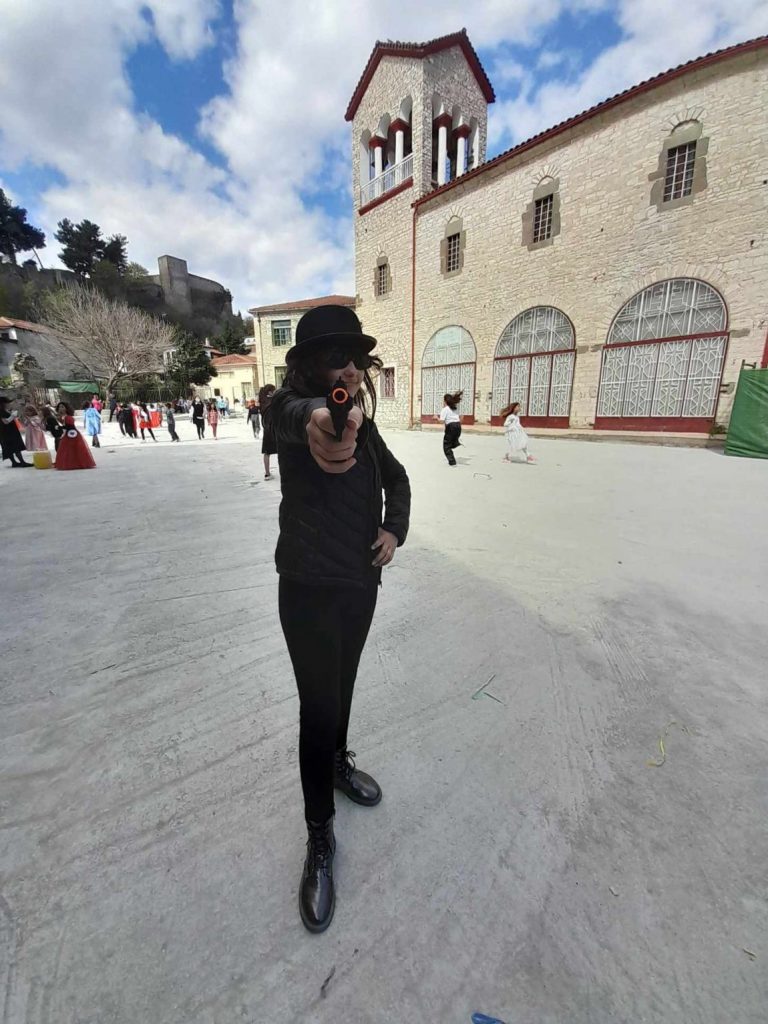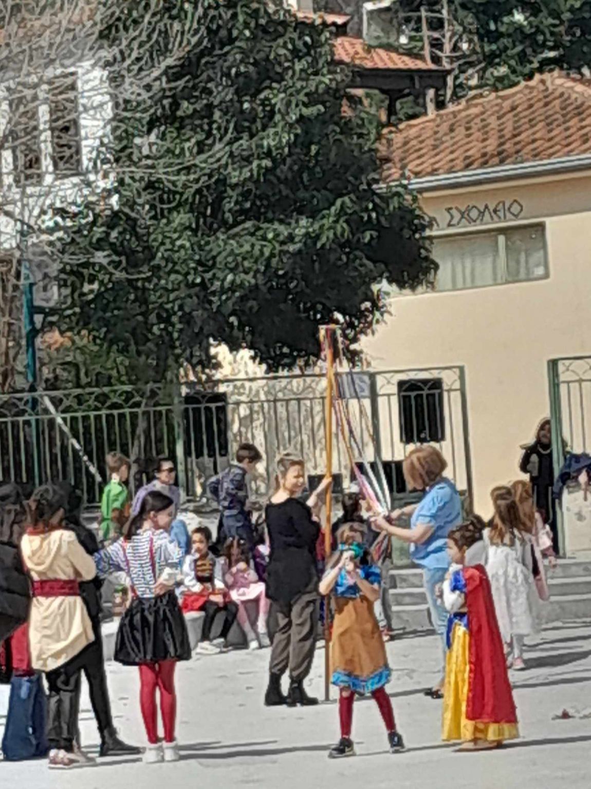 Σε όλα τα σχολεία σήμερα κάνουν αποκριάτικα πάρτι, αφού είναι η τελευταία εβδομάδα της Αποκριάς. Κάποια από αυτά τηρούν το έθιμο με το γαϊτανάκι. Μικροί μαθητές ντύθηκαν και απολαμβάνουν το πάρτι ….σε μια ηλιόλουστη μέρα.