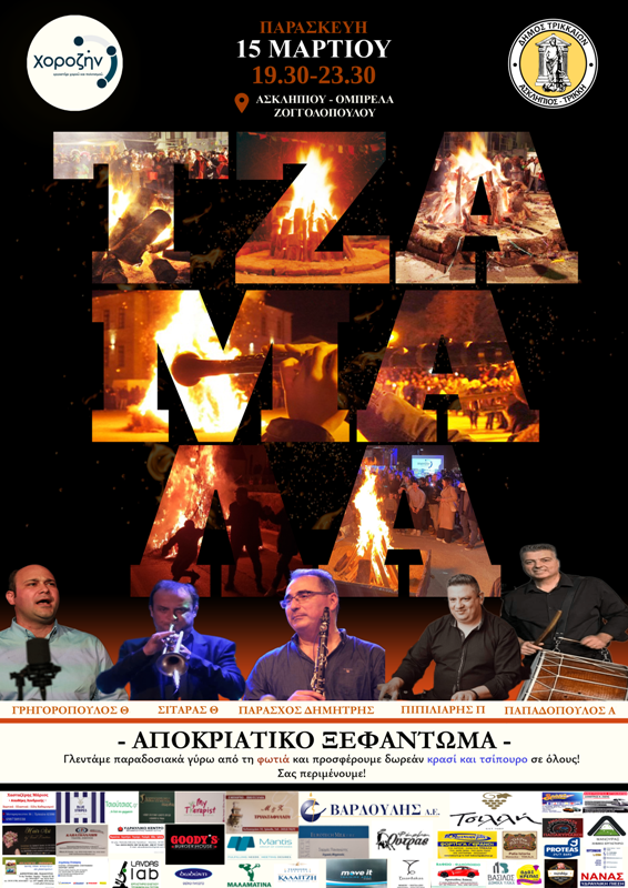 Το Εργαστήρι Χορού και Πολιτισμού «ΧΟΡΟΖΗΝ» και ο Δήμος Τρικκαίων διοργανώνουν για δεύτερη φορά φέτος στα Τρίκαλα μια μεγάλη γιορτή για το τέλος του Τριωδίου. Η περίφημη «Τζαμάλα», ένα αποκριάτικο ξεφάντωμα με σπουδαίους μουσικούς στον πεζόδρομο της Ασκληπιού, θα γεμίσει το χώρο με μουσική μέχρι ξημερώματα της επόμενης μέρας και θα αποτελέσει το έναυσμα για τις γιορτές της τελευταίας Κυριακής της Αποκριάς στα Τρίκαλα.