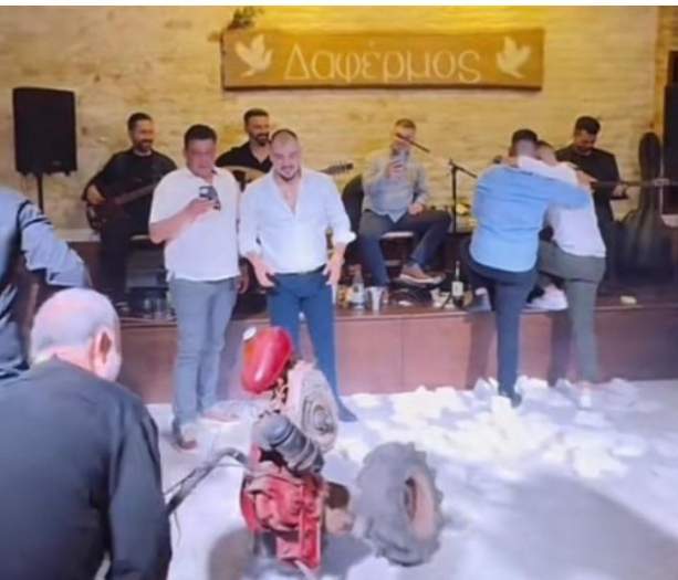 Πάνω στο τσακίρ κέφι, ο θαμώνας εμφανίστηκε ξαφνικά με σκαπτικό μηχάνημα στον αρραβώνα που έγινε σε ταβέρνα στο Τσαλικάκι του Δήμου Μαλεβιζίου στο Ηράκλειο και φυσικά δεν πέρασε απαρατήρητος.