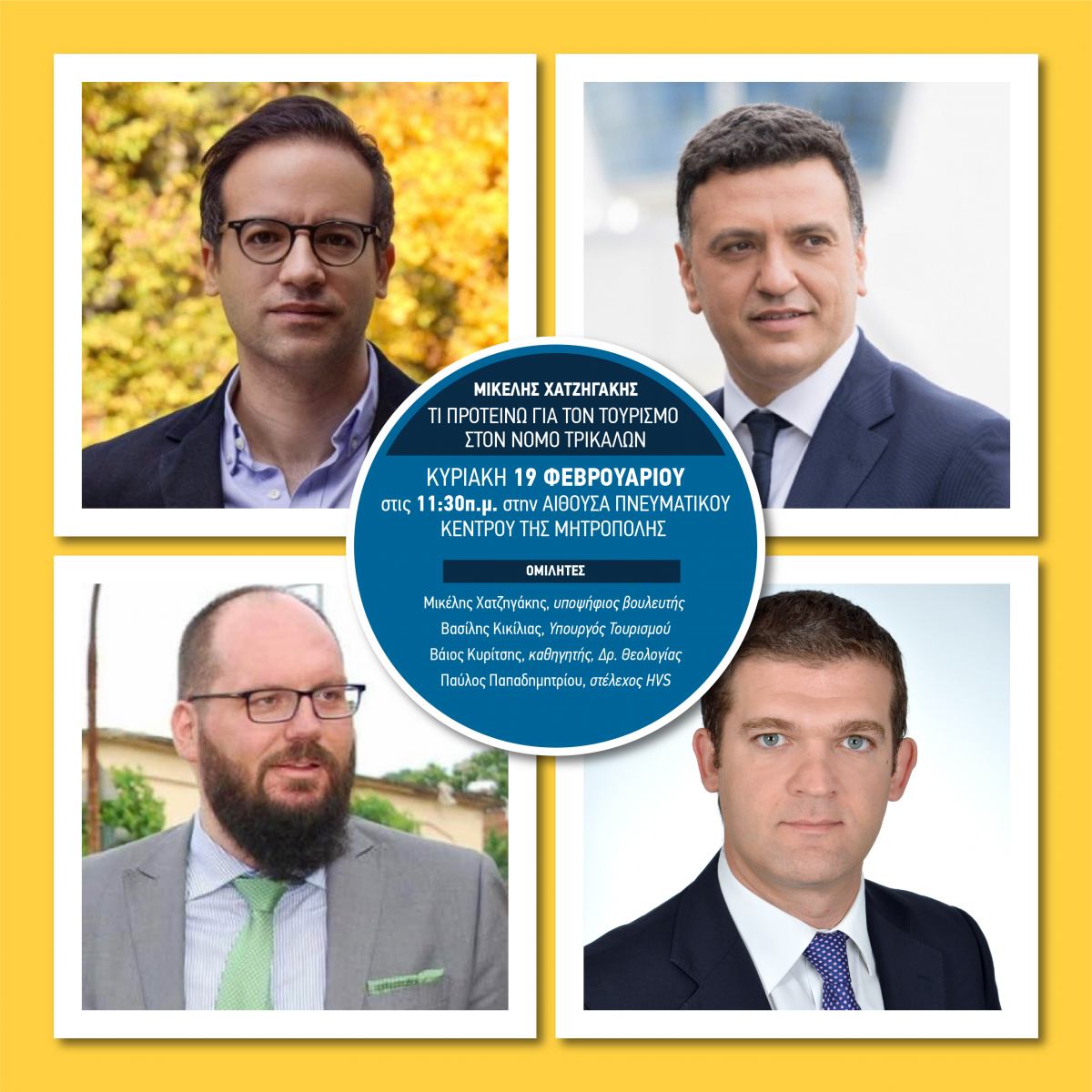 Θεματική εκδήλωση για τον Τουρισμό και τις προοπτικές του στην Π.Ε. Τρικάλων διοργανώνει στις 19 Φεβρουαρίου στις 11.30 π.μ. στην Αίθουσα του Πνευματικού Κέντρου της Μητροπόλεως Τρίκκης, Γαρδικίου και Πύλης (επί της Όθωνος, δίπλα στα παλιά ΚΤΕΛ) ο Μικέλης Χατζηγάκης.