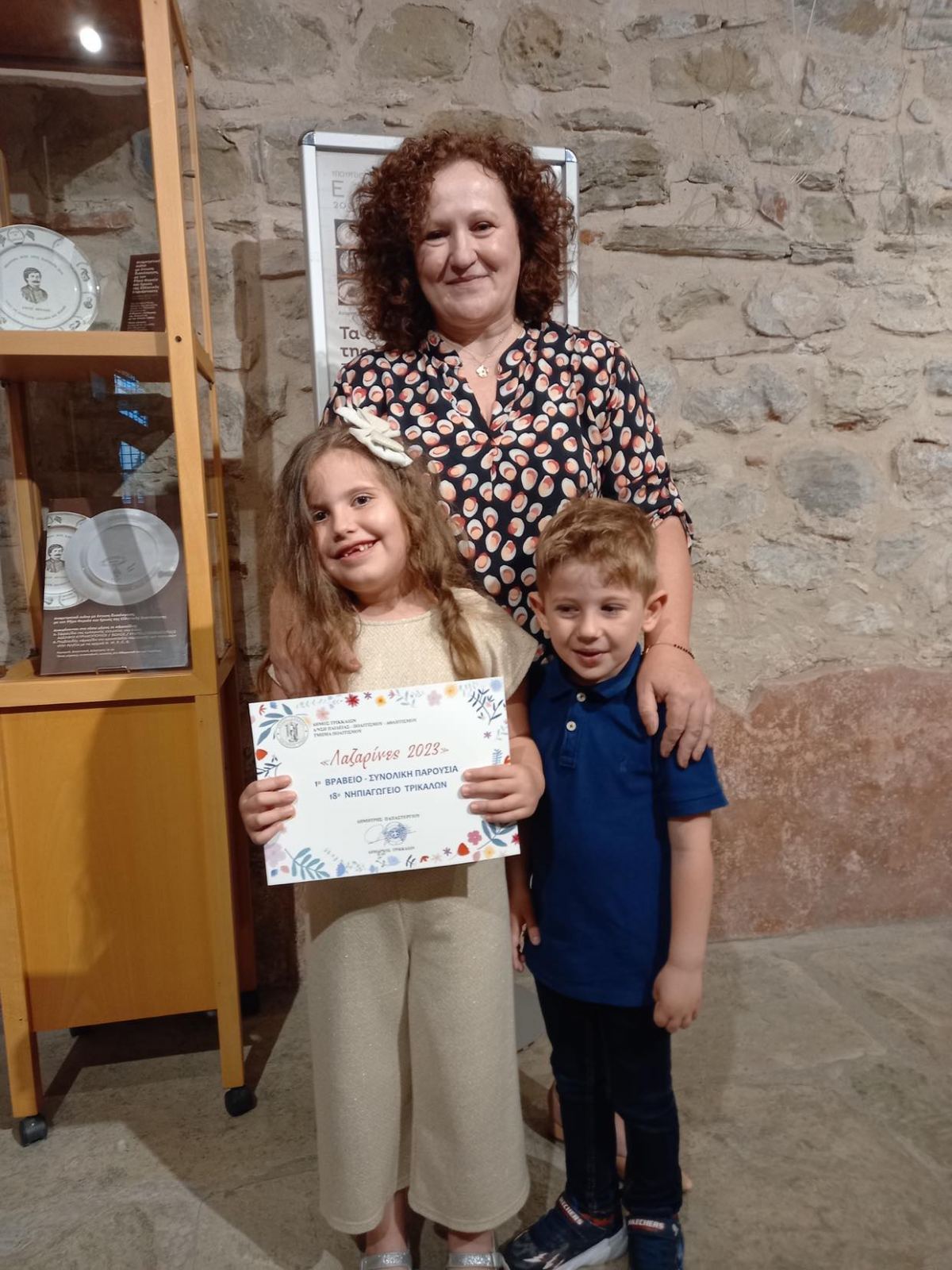 Μια σπουδαία και συμβολική διάκριση πέτυχε φέτος το 18⁰ Νηπιαγωγείο Τρικάλων καθώς απέσπασε το πρώτο βραβείο συνολικής παρουσίας στον διαγωνισμό “Λαζαρίνες 2023″ του δήμου Τρικκαίων. Χθες το απόγευμα απονεμήθηκε το βραβείο στο μουσείο Τσιτσάνη και οι μικρές λαζαρίνες το παρέλαβαν με χαμόγελα και ιδιαίτερη συγκίνηση. Οι μαθήτριες έλαβαν μέρος στο διαγωνισμό με το παραδοσιακό τραγούδι ” Τη ρούγα φουκαλούσα, τη νύφη καρτερούσα” , ένα τραγούδι που μιλά για τη νέα νύφη σε ένα σπίτι. Το παρόν τραγούδι χρονολογείται από το 1920 στην περιοχή της Αγίας Κυριακής. Κληροδοτήθηκε σε εμένα την Ευγενία Ψιλούτσικου, που με τη σειρά μου ” χάρισα” αυτό το οικογενειακό κειμήλιο στο 18ο νηπιαγωγείο, όπου φοιτά και η κόρη μου Παπαθανασίου Ελπινίκη. Βαθύτατα συγκινημένη, που το τραγούδι ειπώθηκε από τα “μικρά μας διαμαντάκια”, ευχαριστώ όλες τις μικρές λαζαρίνες -μαθήτριες και τις οικογένειές τους καθώς και την κυρία Λαμπρογεώργου Μαρία, προϊσταμένη του σχολείου. Τέλος, είναι πολύ σημαντικό να ειπωθεί πως για πρώτη φορά βραβεύτηκε νηπιαγωγείο του δήμου με το βραβείο συνολικής παρουσίας. Καλό Καλοκαίρι σε όλους.
