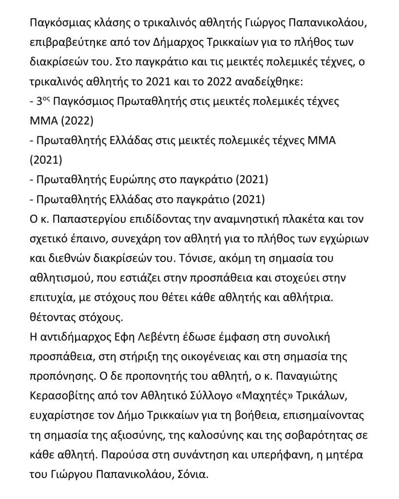 Βράβευση του τρικαλινου αθλητή παγκόσμιας κλάσης από το Δήμαρχο Τρικκαίων
