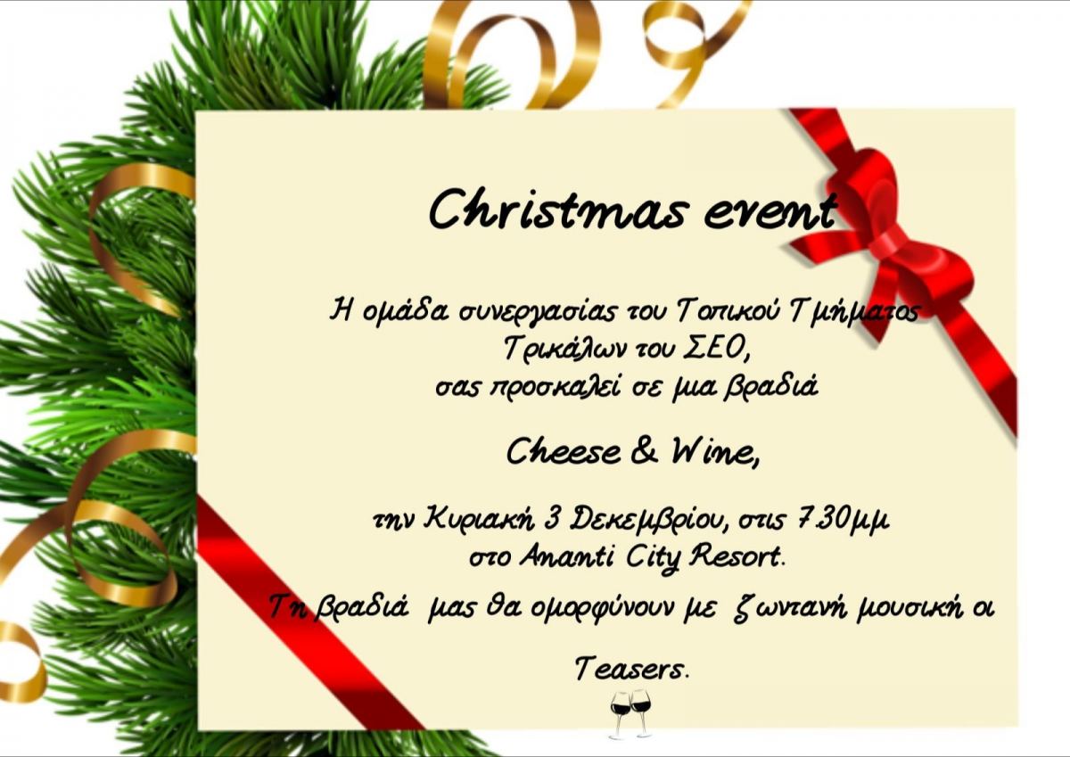 Βραδιά cheese & wine από την ομάδα συνεργασίας του ΣΕΟ Οδηγισμού Τρικάλων την Κυριακή 3 Δεκεμβρίου στις 19.30 στο Ananti Resort .Ένα Christmas event που θα πλαισιώσει μουσικά το συγκρότημα The Teasers.