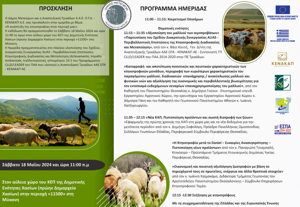 Δήμος Μετεώρων: Αύριο Σάββατο 18/5 η ενημερωτική ημερίδα για την ανάπτυξη της κτηνοτροφίας στην περιοχή μας