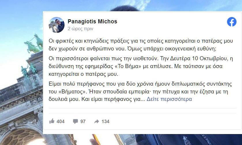 Δείτε την ανάρτηση του Παναγιώτη Μίχου, γιου του 53χρονου βιαστή των Σεπολίων