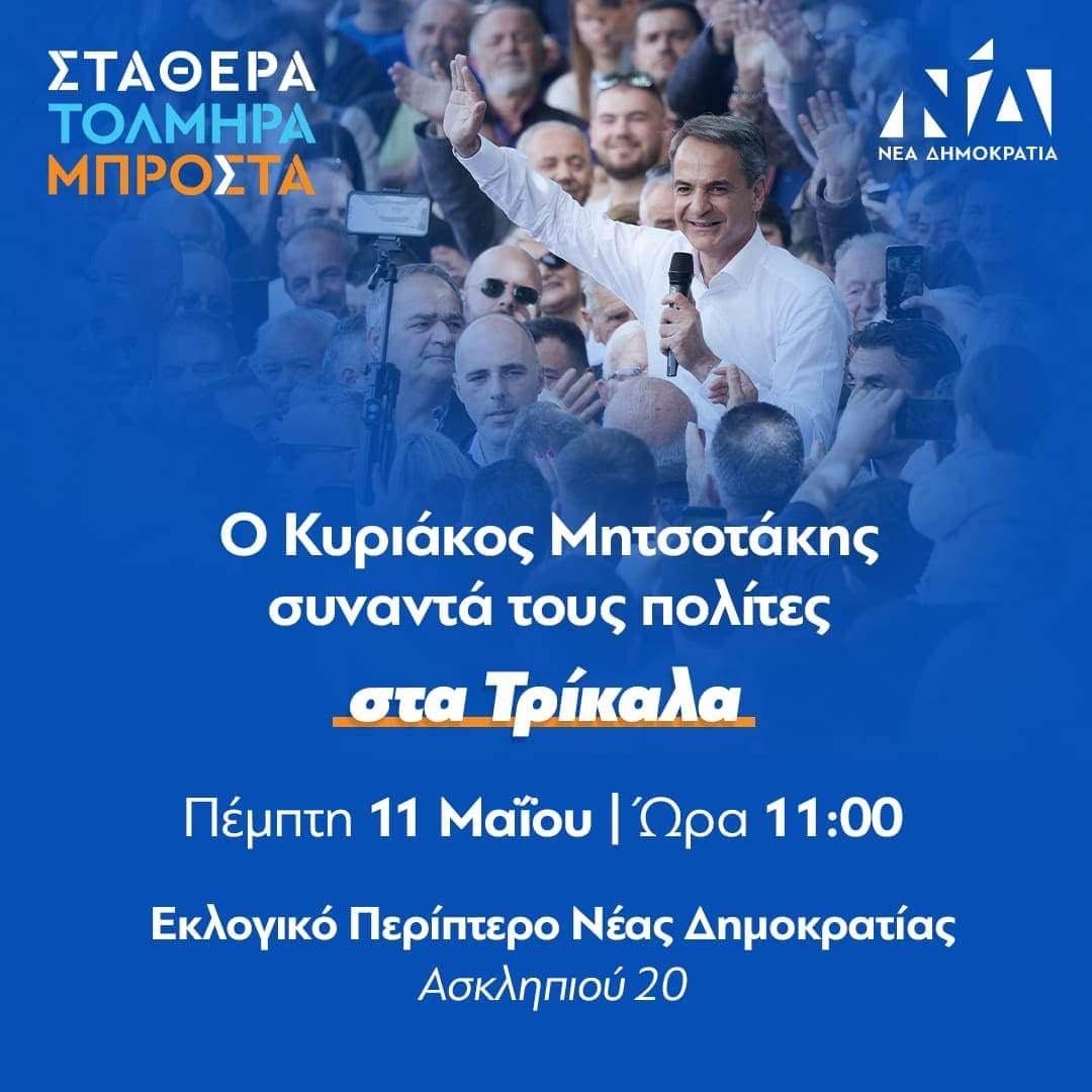 Την Πέμπτη 11 Μαΐου στις 11 πμ θα βρίσκεται στα Τρίκαλα ο Πρωθυπουργός και Πρόεδρος της ΝΔ Κυριάκος Μητσοτάκης .