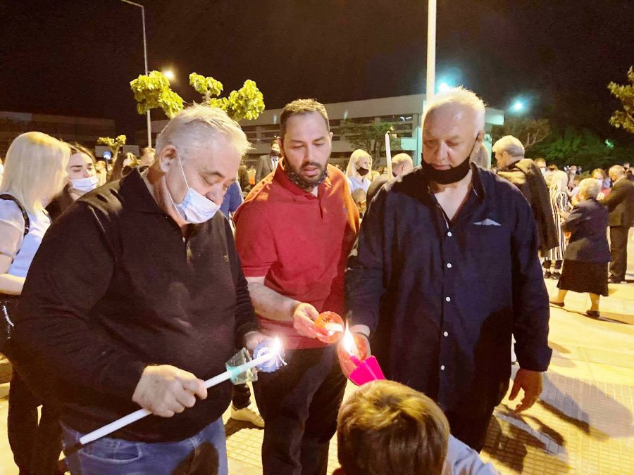 Σε κλίμα κατάνυξης και λαμπρότητας, τελέστηκε στον Ιερό Ναό του Αγίου Νικολάου στα Τρίκαλα η ιερουργία της Αφής του Αγίου Φωτός με πλήθος πιστών να παρακολουθούν την τελετή .Ανάμεσά τους και η γνωστή οικογένεια Χύμα με τους αδερφούς Μίμη και Τζώρτζη να ανταλλάσσουν ευχές με τα αγαπημένα τους πρόσωπα ….Μαζί τους και ο πρωτότοκος γιός του, Τζώρτζη Στέλιος ο οποίος έσπευσε να πάρει πρώτος το ανέσπερο φως της αναστάσεως