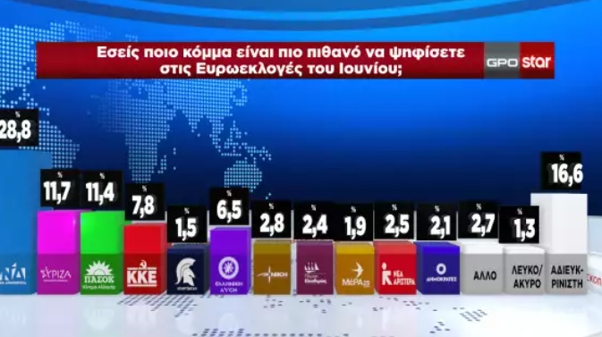 Στην πρόθεση ψήφου τα κόμματα συγκεντρώνουν: Νέα Δημοκρατία 28,8% με πτώση 0.4% σε σχέση με την προηγούμενη μέτρηση, ΣΥΡΙΖΑ 11,7% με άνοδο 0,8% , ΠΑΣΟΚ 11,4% με άνοδο 0,3%, ΚΚΕ 7,8% με άνοδο 0,3%, Ελληνική Λύση 6,5%, καταγράφοντας την μεγαλύτερη αύξηση ποσοστών κατά 1,1%. Και ακολουθούν: Νίκη 2,8%, Νέα Αριστερά 2,5%, Πλεύση Ελευθερίας 2,4%, Δημοκράτες – Α.Λοβέρδος 2,1%, Μέρα 25 1,9% και Σπαρτιάτες 1,5%.