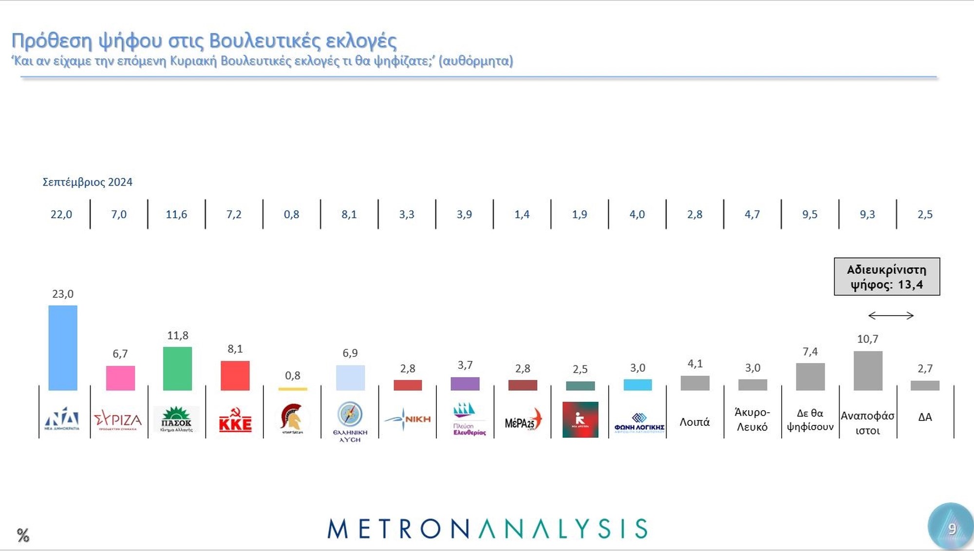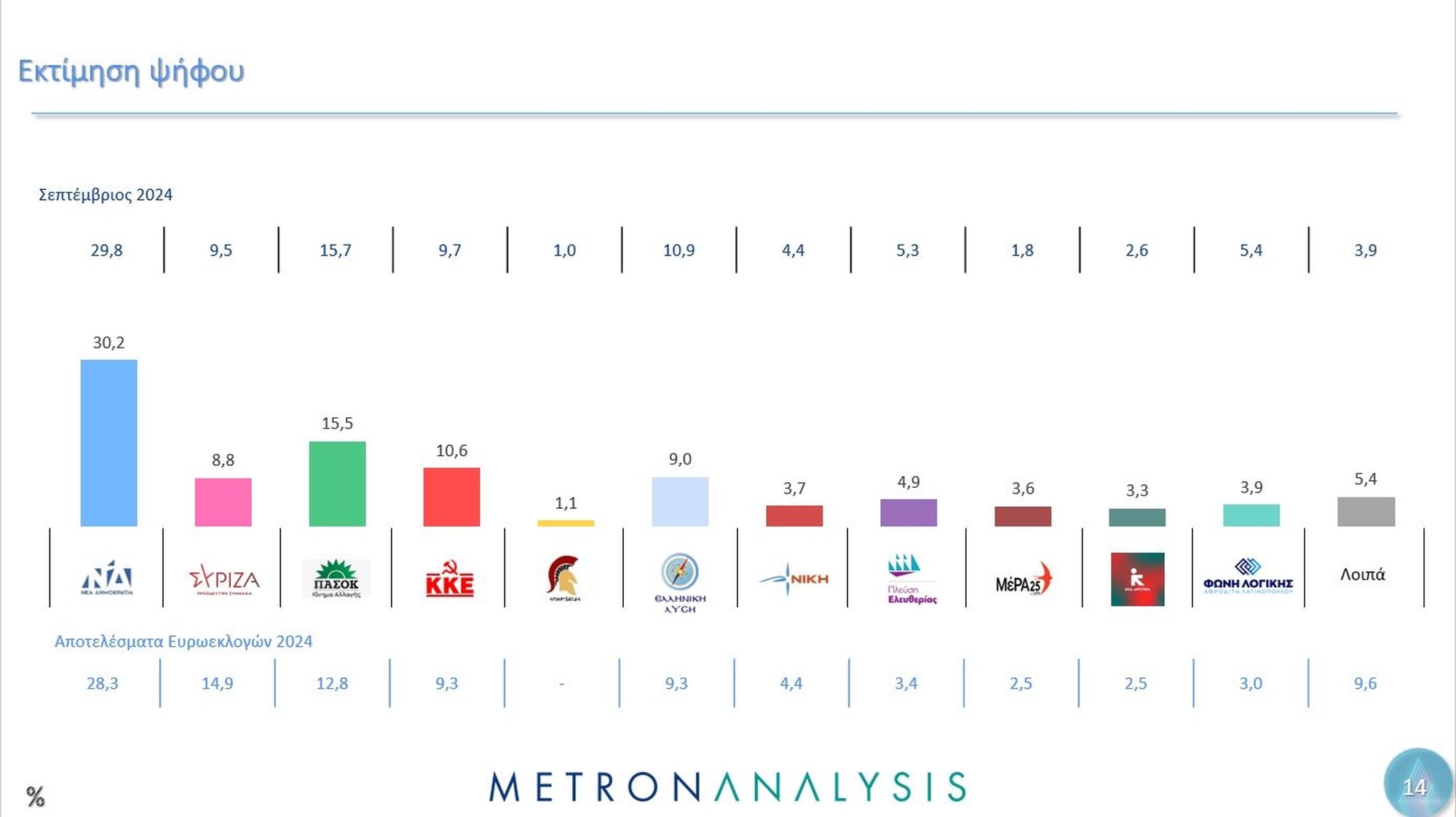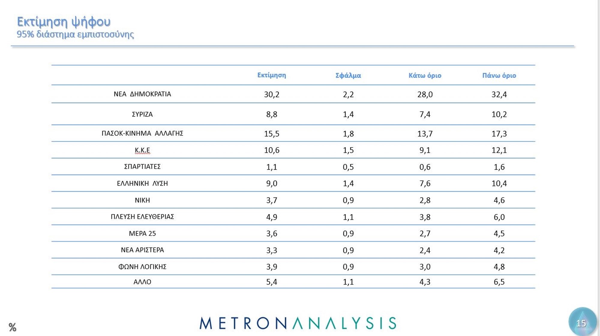 Σύμφωνα με την εκτίμηση ψήφου της Metron Analysis η Νέα Δημοκρατία αυτή τη φορά ξεπερνά οριακά το “ψυχολογικό” όριο του 30%, με 30,2%, ο ΣΥΡΙΖΑ υποχωρεί στην πέμπτη θέση με 8,8%, το ΠΑΣΟΚ με 15,5% παραμένει η “δημοσκοπική αξιωματική αντιπολίτευση”, το ΚΚΕ είναι στην τρίτη θέση με 10,6%, η Ελληνική Λύση στην τέταρτη με 9%, η Πλεύση Ελευθερίας είναι στο 4,9%, η Νίκη στο 3,7% και η Φωνή της Λογικής στο 3,9%. Η κρίση του ΣΥΡΙΖΑ φαίνεται ευνοεί κάπως τη Νέα Αριστερά και το ΜέΡΑ25 που δείχνουν να παίρνουν το όριο του 3%.