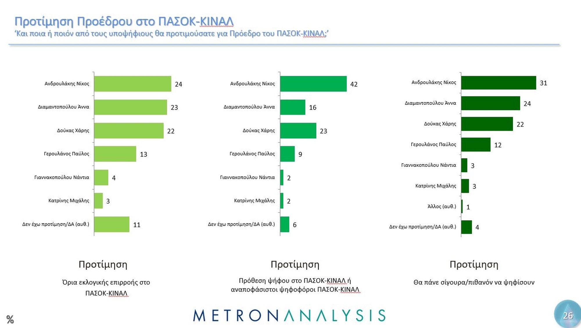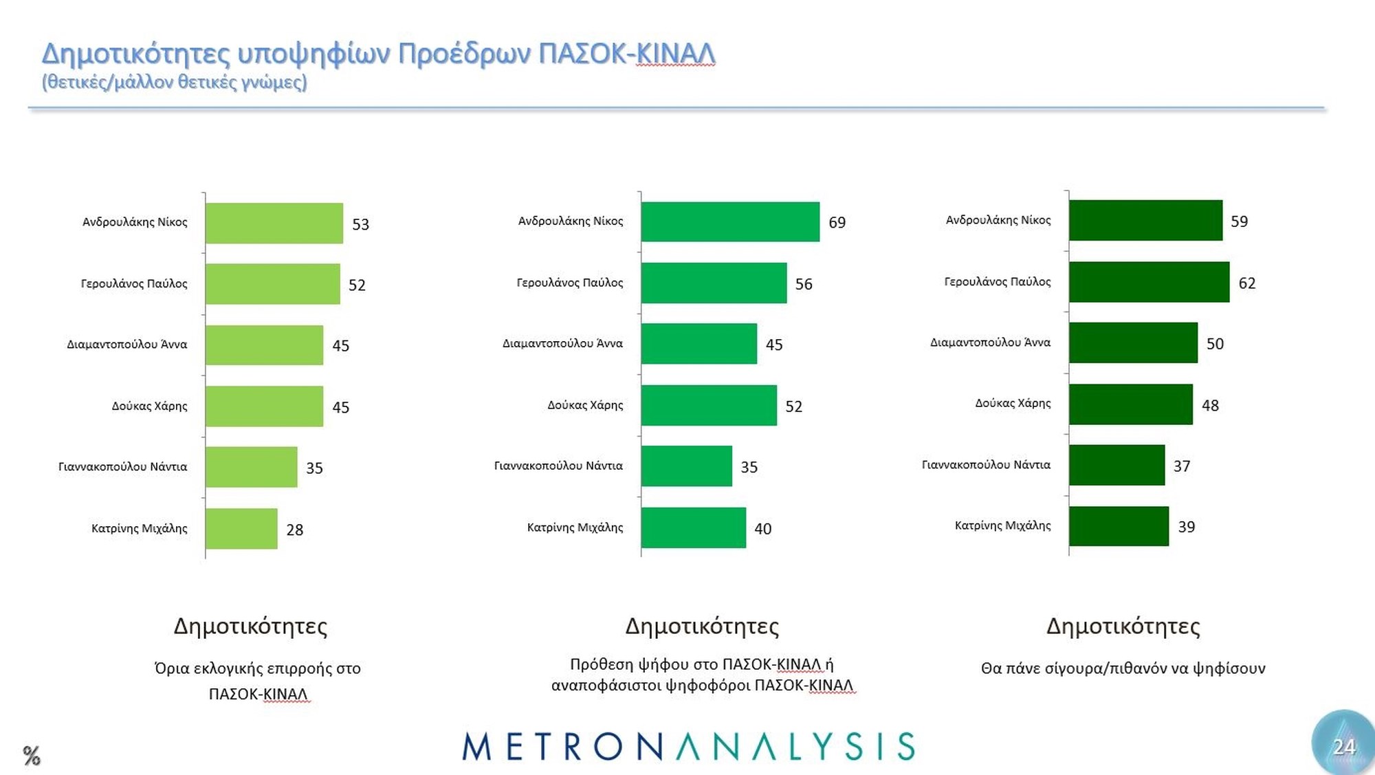 Καταρχάς η έρευνα μετρά τη δημοτικότητα των υποψηφίων προέδρων του ΠΑΣΟΚ. δηλαδή τις θετικές/μάλλον θετικές γνώμες για αυτούς. Ο Νίκος Ανδρουλάκης προηγείται στο σύνολο της εκλογικής επιρροής, με τον Παύλο Γερουλάνο να ακολουθεί και τρίτη την Άννα Διαμαντοπούλου. Ο Νίκος Ανδρουλάκης προηγείται και στους ψηφοφόρους πάλι με δεύτερο τον Παύλο Γερουλάνο, με τον τελευταίο να προηγείται ως προς τη δημοτικότητα στην κατηγορία αυτών που σίγουρα θα πάνε να ψηφίσουν.