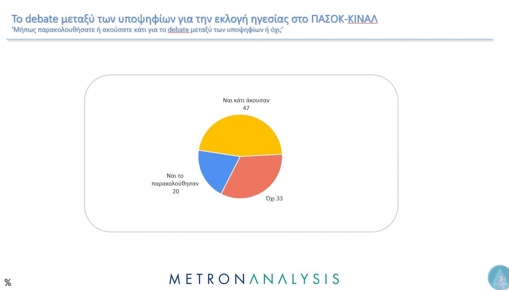 Ως προς τις εντυπώσεις έχει ενδιαφέρον ότι μεταξύ αυτών που το παρακολούθησαν περισσότερες θετικές γνώμες είχε η Άννα Διαμαντοπούλου, με δεύτερο τον Νίκο Ανδρουλάκη και τρίτο τον Χάρη Δούκα. Αντιθέτως, ως προς τον απόηχο του debate μεταξύ αυτών που “κάτι άκουσαν” πιο πολλές θετικές εντυπώσεις έχει ο Νίκος Ανδρουλάκης, με δεύτερο τον Χάρη Δούκα και τρίτη την Άννα Διαμαντοπουλου.
