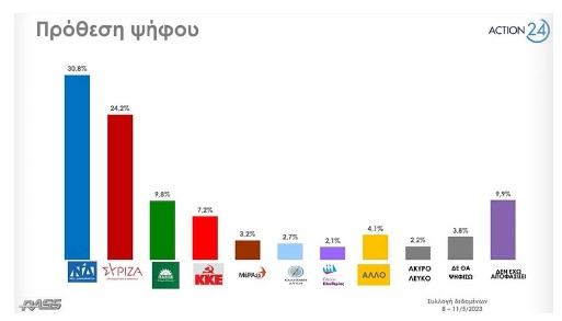 Προβάδισμα 6,6 ποσοστιαίων μονάδων της Νέας Δημοκρατίας έναντι του ΣΥΡΙΖΑ εμφανίζει η δημοσκόπηση της RASS, που διενεργήθηκε για λογαριασμό του ACTION 24.