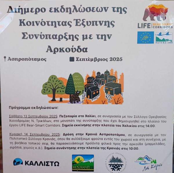 Διήμερο βιωματικών δράσεων στον Ασπροπόταμο, με στόχο την ευαισθητοποίηση και την ενίσχυση της κοινωνικής αποδοχής της καφέ αρκούδας, μέσα από την επαφή με τον τόπο, τη φύση και τις τοπικές κοινότητες, διοργανώνεται το Σαββατοκύριακο 13 και 14 Σεπτεμβρίου 2025, στο πλαίσιο του ευρωπαϊκού προγράμματος LIFE Bear-Smart Corridors και της Κοινότητας Έξυπνης Συνύπαρξης με την Αρκούδα.