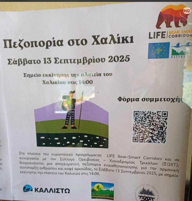 Σε συνεργασία με τον Σύλλογο Ορειβασίας – Χιονοδρομίας Τρικάλων (ΣΟΧΤ), θα πραγματοποιηθεί πεζοπορία στο «Μονοπάτι της Συνύπαρξης», μια διαδρομή που δημιουργήθηκε στο πλαίσιο του έργου και διασχίζει περιοχές πλούσιες σε καρποφόρα αυτοφυή δέντρα, όπως κράνα, μηλιές, κορομηλιές και άλλα είδη. Κατά τη διάρκεια της διαδρομής, θα συλλέξουμε καρπούς και θα ενημερωθούμε για τη σημασία αυτών των δέντρων, τόσο ως πολύτιμου φυσικού πόρου για τις τοπικές κοινότητες, όσο και ως κρίσιμου παράγοντα στη μείωση των συγκρούσεων με την αρκούδα, μέσα από την ενίσχυση στρατηγικών πρόληψης και διαχείρισης. Το βράδυ θα ακολουθήσει διανυκτέρευση στο Χαλίκι, με χαλαρή συζήτηση και ανταλλαγή εμπειριών.