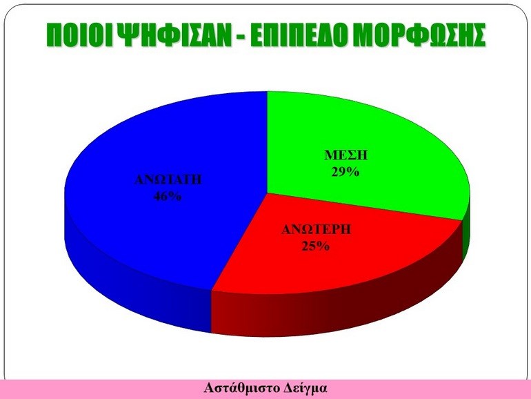 Όσον αφορά τώρα στο επίπεδο μόρφωσης των συμμετεχόντων στην έρευνα, το 46% διαθέτει ανώτατη μόρφωση, το 25% ανώτερη και το 29% τελείωσε τη Μέση Εκπαίδευση (πίνακας 4).