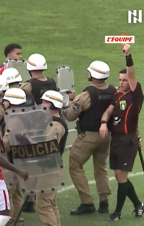 Απίστευτες εικόνες στην αναμέτρηση της Παρανά Κλουμπ με την Κοριτίμπα στη Βραζιλία, όπου ο διαιτητής χρειάστηκε την είσοδο των αστυνομικών στον αγωνιστικό χώρο, για να καταφέρει να βγάλει κόκκινη κάρτα και να αποβάλλει έναν ποδοσφαιριστή των γηπεδούχων.