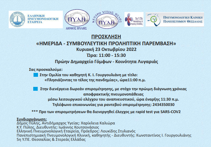 Ο Δήμος Πύλης σε συνεργασία με το Κέντρο Υγείας Πύλης, με την Ελληνική Πνευμολογική Εταιρία, με την 5η Υ.Πε. Θεσσαλίας & Στερεάς Ελλάδας και με την Πνευμολογική Κλινική του Πανεπιστημίου Θεσσαλίας οργανώνει επίκαιρη Ημερίδα Ιατρικού ενδιαφέροντος με τίτλο «Πλησιάζοντας το τέλος της πανδημίας».
