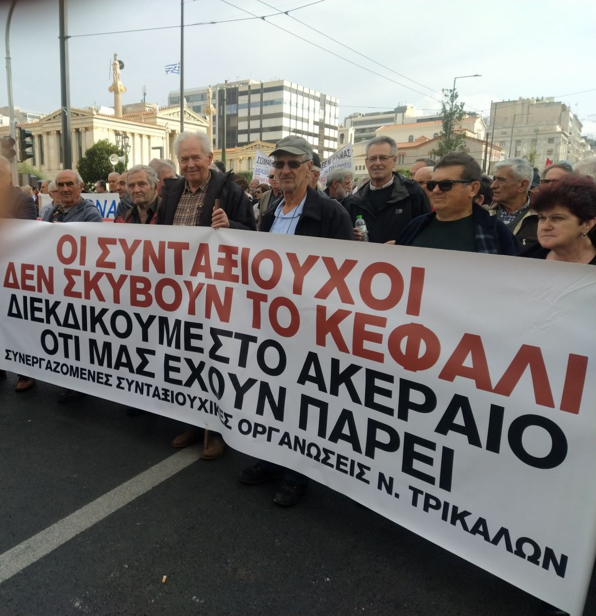 Δυναμικό παρών, κρατώντας πανό και φωνάζοντας συνθήματα, έδωσαν την Παρασκεύη, στην Αθήνα δεκάδες Τρικαλινοι συνταξιούχοι που βρέθηκαν στο κέντρο της πρωτεύουσας μαζί με χιλιάδες συναδέλφους από όλη τη χώρα. Οι συνταξιούχοι αγωνίζονται σθεναρά για να μπορέσουν να ζήσουν με αξιοπρέπεια. Διεκδικούν, μεταξύ άλλων, ουσιαστικές αυξήσεις στις συντάξεις και πλήρη κρατική εγγύηση όλων των κύριων και επικουρικών συντάξεων.
