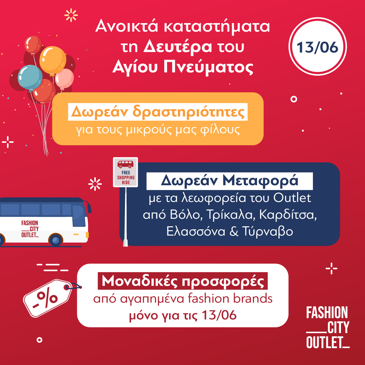 Την Δευτέρα του Αγίου Πνεύματος Δωρεάν λεωφορεία θα ξεκινήσουν στις 11 το πρωί από Βόλο, Τρίκαλα, Καρδίτσα, Ελασσόνα και Τύρναβο με προορισμό το Fashion City Outlet τον αγαπημένο εκπτωτικό προορισμό όλης της Θεσσαλίας!
