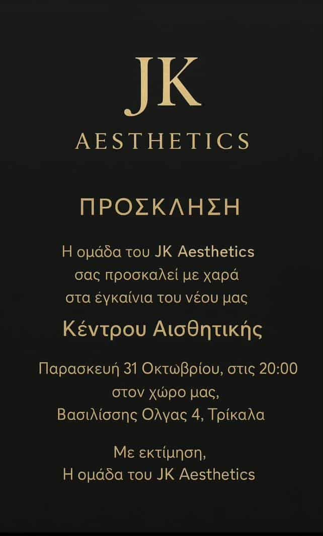 Η ομάδα του JK Aesthetics σας προσκαλεί στα εγκαίνια του ολοκαίνουργιου, πολυτελούς πολυχώρου ομορφιάς, την **Παρασκευή 31 Οκτωβρίου, στις 20:00, στη Βασιλίσσης Όλγας 4, στα Τρίκαλα.Ελάτε να γνωρίσετε από κοντά έναν μοναδικό χώρο αφιερωμένο στην περιποίηση, την ανανέωση και την ευεξία, να γνωρίσετε την ομάδα και να ζήσετε μια βραδιά γεμάτη λάμψη και θετική ενέργεια!