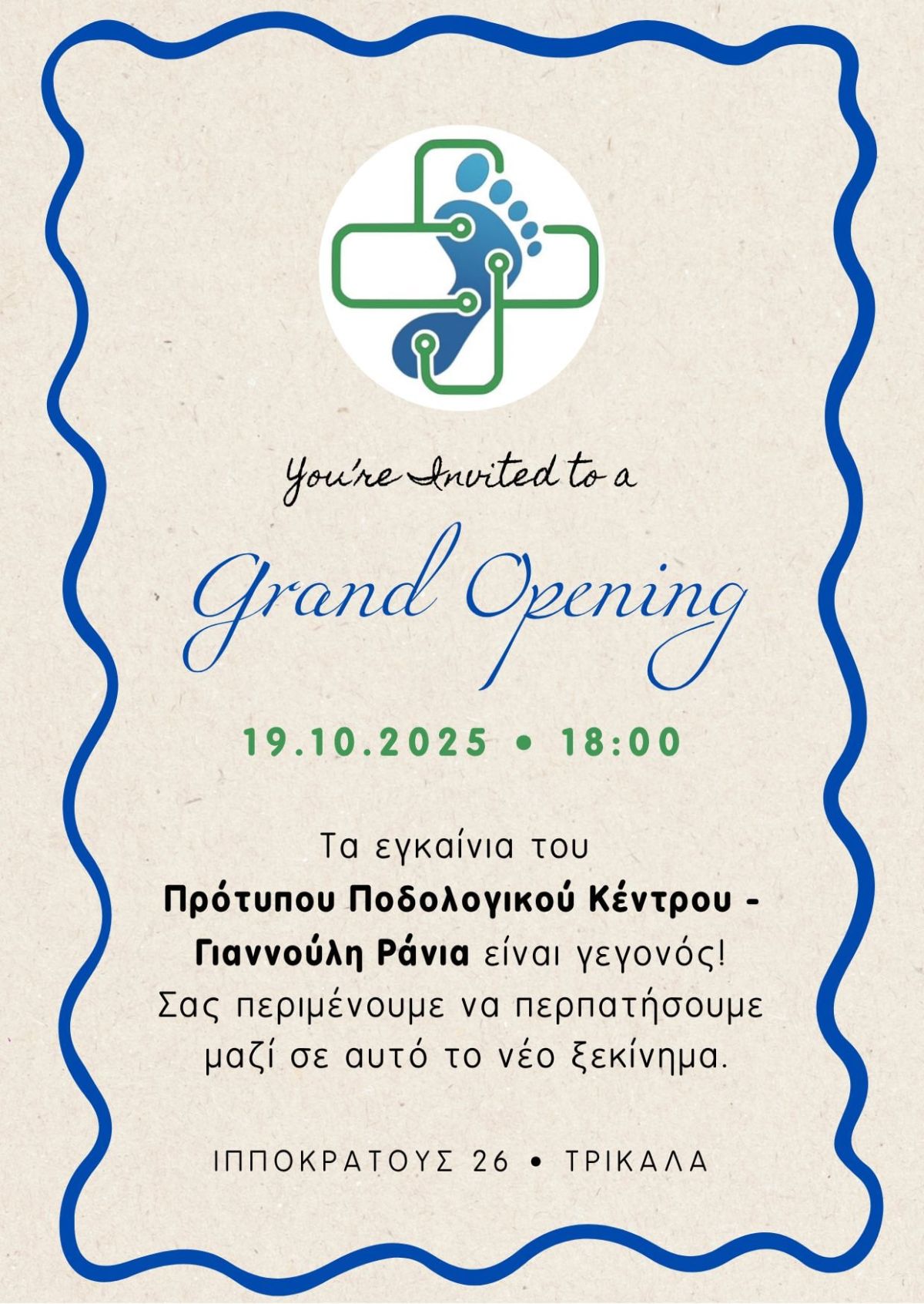 Την Κυριακή 19 Οκτωβρίου στις 18.00 θα πραγματοποιηθούν τα εγκαίνια του Πρότυπου Ποδολόγικου Κέντρου της Ράνιας Γιαννούλη, προσφέροντας εξειδικευμένες υπηρεσίες φροντίδας και υγείας των κάτω άκρων, με γνώμονα την επιστημονική κατάρτιση και τον σεβασμό στον άνθρωπο.