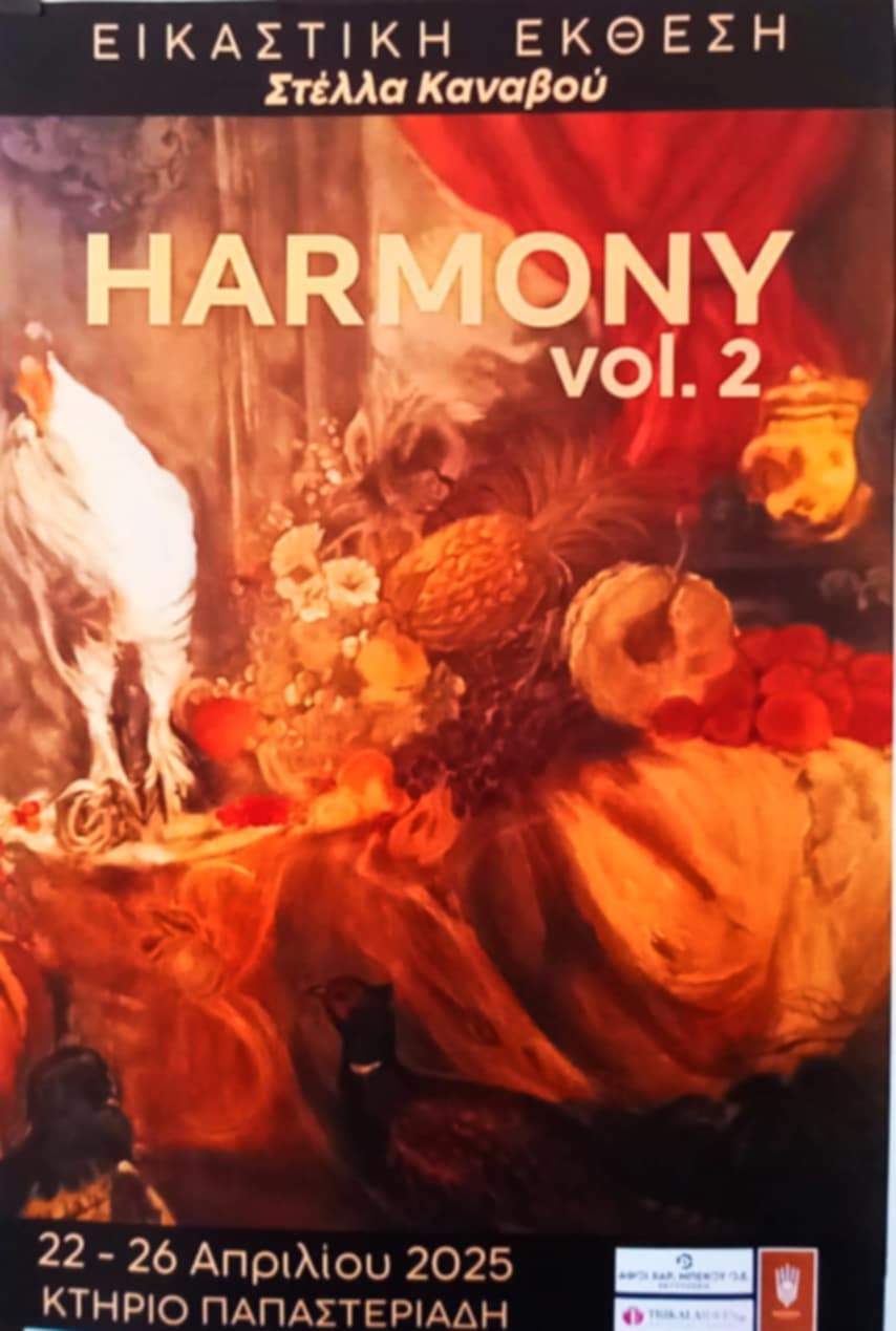 Την Τρίτη 22 Απριλιου 2025, πραγματοποιείται η έκθεση ζωγραφικής “Harmony” της Στέλλας Καναβού, στο κτήριο Παπαστεριάδη, Στουρνάρα 14, στα Τρίκαλα. Μια έκθεση που απεικονίζει φιγούρες Βικτωρίας, όμορφα κορίτσια και κυρίες, πορτραίτα του σήμερα, πολύχρωμα άνθη, περίτεχνα βάζα, εξωτικά πουλιά, που μας μεταφέρουν στον κόσμο της φαντασίας αλλά και της πραγματικότητας, της αναλλοίωτης στο χρόνο. Η τέχνη, που ποτέ δεν τελειώνει, επανέρχεται ανανεωμένη και κάθε φορά έχει τόσα πολλά να μας δώσει! Το ζωγραφικό collage, με αναφορές στο realistic και style realistic, αναδομεί σε μια εκ νέου κατάσταση εικόνες, ζωγραφιές, φωτογραφίες. Το παλιό, που δεν τελειώνει ποτέ, αλλά εμφανίζεται σε μια νέα πραγματικότητα, αιώνια, με την προβολή της αλήθειας. Χρωματικές εκρήξεις αλλά και ήρεμη παλέτα, λεπτομερείς απεικονίσεις αλλά και πιο αφηρημένα δευτέρα πλάνα, αναπαράγουν μια ζωγραφιστή φωτογραφία, προσδιορίζοντας το ιδιαίτερο προσωπικό στυλ της εικαστικής δημιουργού. Διάρκεια έκθεσης 22-26 Απριλίου 2025.