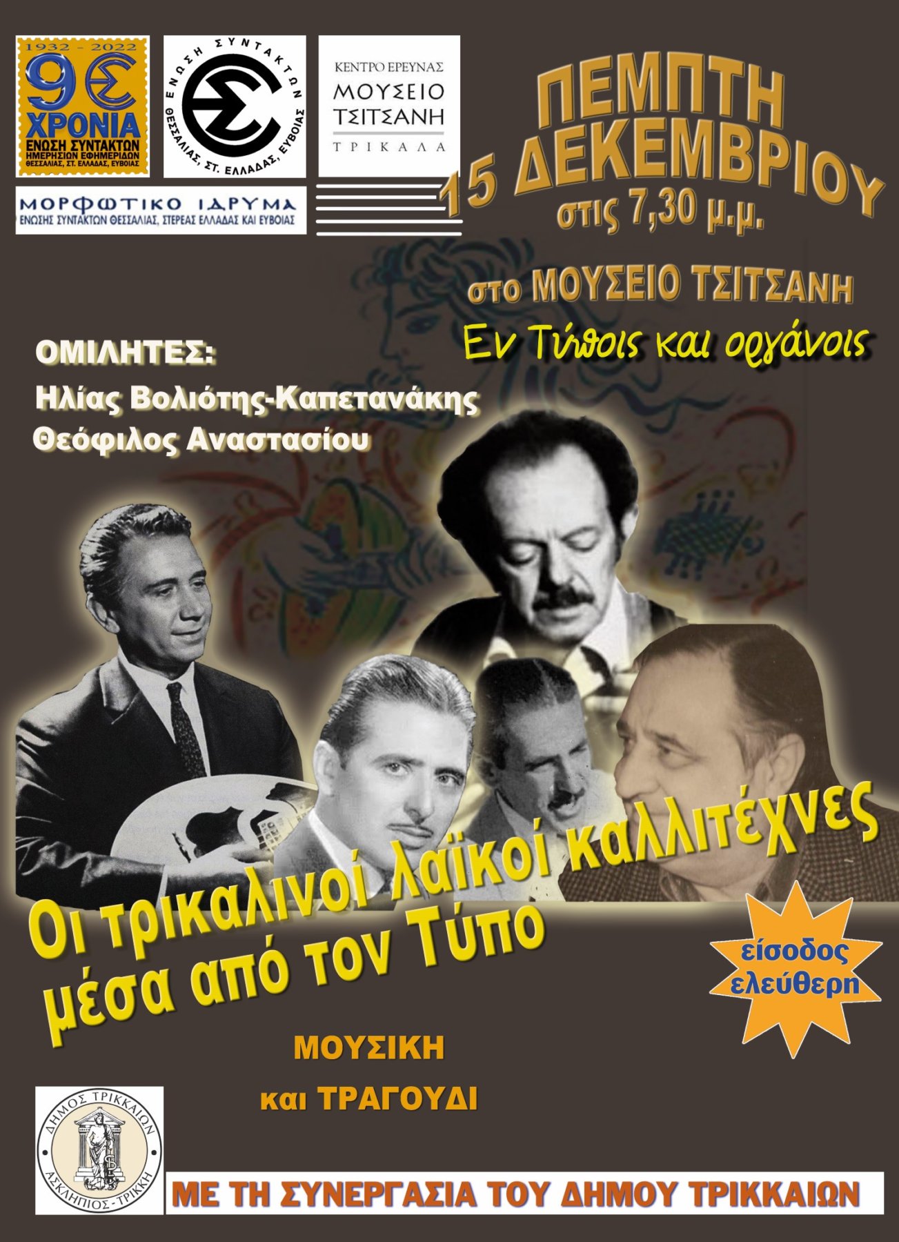 «Οι Τρικαλινοί λαϊκοί καλλιτέχνες μέσα από τον Τύπο». Αυτό είναι το θέμα της εκδήλωσης που διοργανώνει στα Τρίκαλα για τον γιορτασμό των 90 χρόνων από την ίδρυση της η Ένωση Συντακτών Θεσσαλίας, Στερεάς Ελλάδας και Εύβοιας, μαζί με το Μορφωτικό της Ίδρυμα και το Μουσείο Τσιτσάνη.