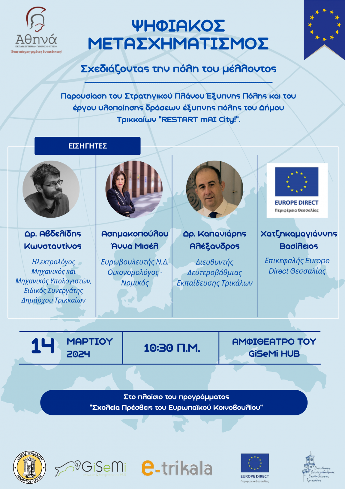 Η εκδήλωση, η οποία είναι συνδιοργάνωση του Σχολείου μας με το e-Trikala, το Δήμο Τρικκαίων, τη Δευτεροβάθμια Εκπαίδευση Τρικάλων και το Europe Direct Θεσσαλίας, θα λάβει χώρα την Πέμπτη 14 Μαρτίου 2024 στο αμφιθέατρο του GiSeMi HUB Κόμβος Καινοτομίας & Επιχειρηματικότητας στις 10.30.