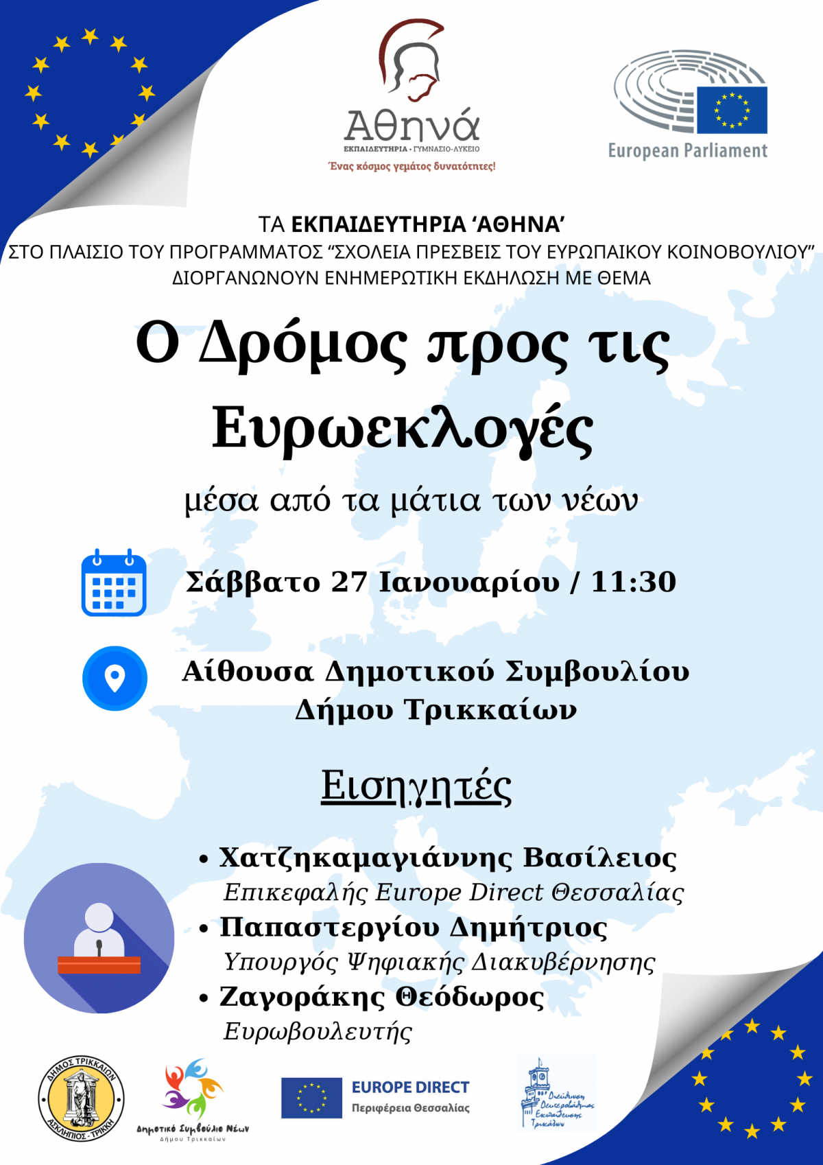Ανοικτή ενημερωτική εκδήλωση, με ιδιαίτερη έμφαση στους νέους και τις νέες των Τρικάλων, συνδιοργανώνουν τα Εκπαιδευτήρια «Αθηνά», ο Δήμος Τρικκαίων, το Δημοτικό Συμβούλιο Νέων, η Δ/νση Δευτεροβάθμιας Εκπαίδευσης Τρικάλων και το Europe direct Θεσσαλίας.