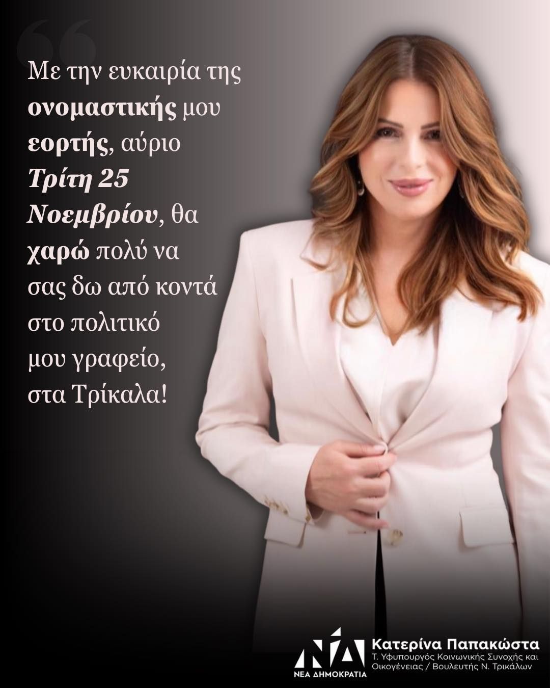 Με αφορμή την ονομαστική της εορτή, η βουλευτής Κατερίνα Παπακώστα ανοίγει αύριο, Τρίτη 25 Νοεμβρίου, τις πόρτες του πολιτικού της γραφείου στα Τρίκαλα, προσκαλώντας πολίτες και φίλους να ανταλλάξουν ευχές και να συζητήσουν από κοντά για ζητήματα της επικαιρότητας και της καθημερινότητας. Από τις 10:00 έως τις 14:00 και από τις 18:00 έως τις 20:00, στην οδό Γαριβάλη 7-9, η κ. Παπακώστα επιδιώκει έναν άμεσο και ουσιαστικό διάλογο με όσους επιθυμούν να εκφράσουν σκέψεις, ανησυχίες και προτάσεις, στο πλαίσιο μιας ζεστής και ανοιχτής συνάντησης με την τοπική κοινωνία.