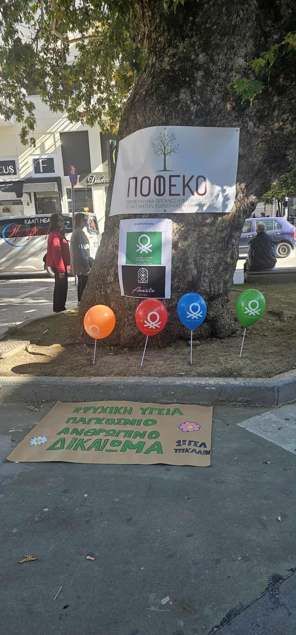 Με αφορμή την Παγκόσμια Ημέρα Ψυχικής Υγείας, η Πανελλήνια Οργάνωση Φροντίδας Ευαίσθητων Κοινωνικών Ομάδων (ΠΟΦΕΚΟ) πραγματοποίησε σήμερα ξεχωριστές δράσεις ευαισθητοποίησης και ενημέρωσης στην πλατεία Δεσποτικού Τρικάλων.