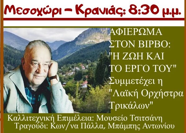 Με την αναγγελία της κίνησης για ίδρυση και δημιουργία «Σπιτιού Τρικαλινών Δημιουργών», ο Δήμαρχος Τρικκαίων κ. Δημήτρης Παπαστεργίου «άνοιξε» τις εργασίες της ημερίδας για τον μεγάλο μας στιχουργό,. Κώστα Βίρβο. Η ημερίδα και η μουσική συνάντηση που διοργανώνεται από το 32ο Δημοτικό Σχολείο Τρικάλων «Κώστας Βίρβος», αφορά στην προσπάθεια ανάδειξης του πολυποίκιλου ποιητικού – στιχουργικού του έργου.