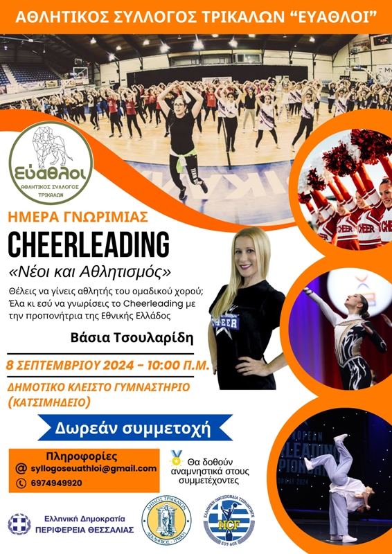 Ο ΑΘΛΗΤΙΚΟΣ ΣΥΛΛΟΓΟΣ ΤΡΙΚΑΛΩΝ ¨ΕΥΑΘΛΟΙ¨ διοργανώνει την Κυριακή 8 Σεπτεμβρίου 2024 – 10:00 π.μ. στο Δημοτικό Κλειστό Γυμναστήριο (Κατσιμήδειο) εκδήλωση γνωριμίας των παιδιών της ευρύτερης περιοχής μας με το Cheerleading !!