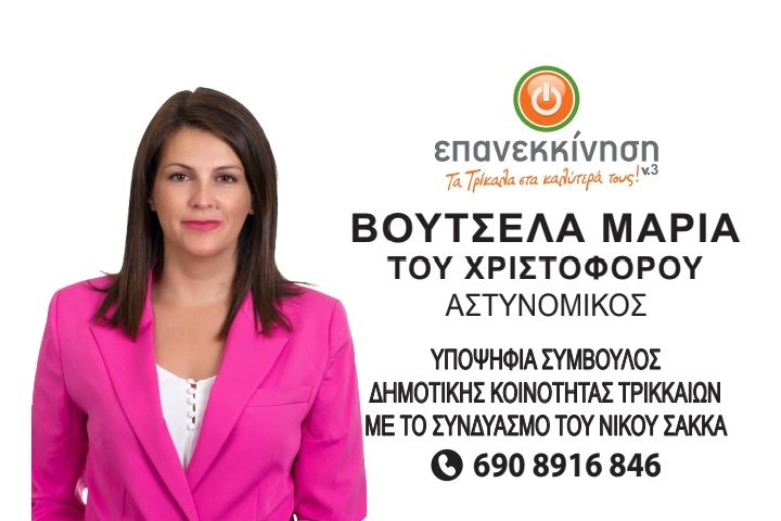 Μια δυναμική γυναίκα με όρεξη για προσφορά στον τόπο επέλεξε να κατέβει στον στίβο της αυτοδιοίκησης στις ερχόμενες εκλογές ως υποψήφια στο πλευρό του Νίκου Σακκά. Η Μαρία Βουτσελά αποτελεί μια νέα, δυνατή προσθήκη στον συνδυασμό Επανεκκίνηση τώρα και θα διεκδικήσει την εκλογή της στο Τοπικό Συμβούλιο της Κοινότητας Τρικκαίων. Είναι αστυνομικός υπηρετεί στα Τρίκαλα, είναι παντρεμένη και μητέρα δύο παιδιών.