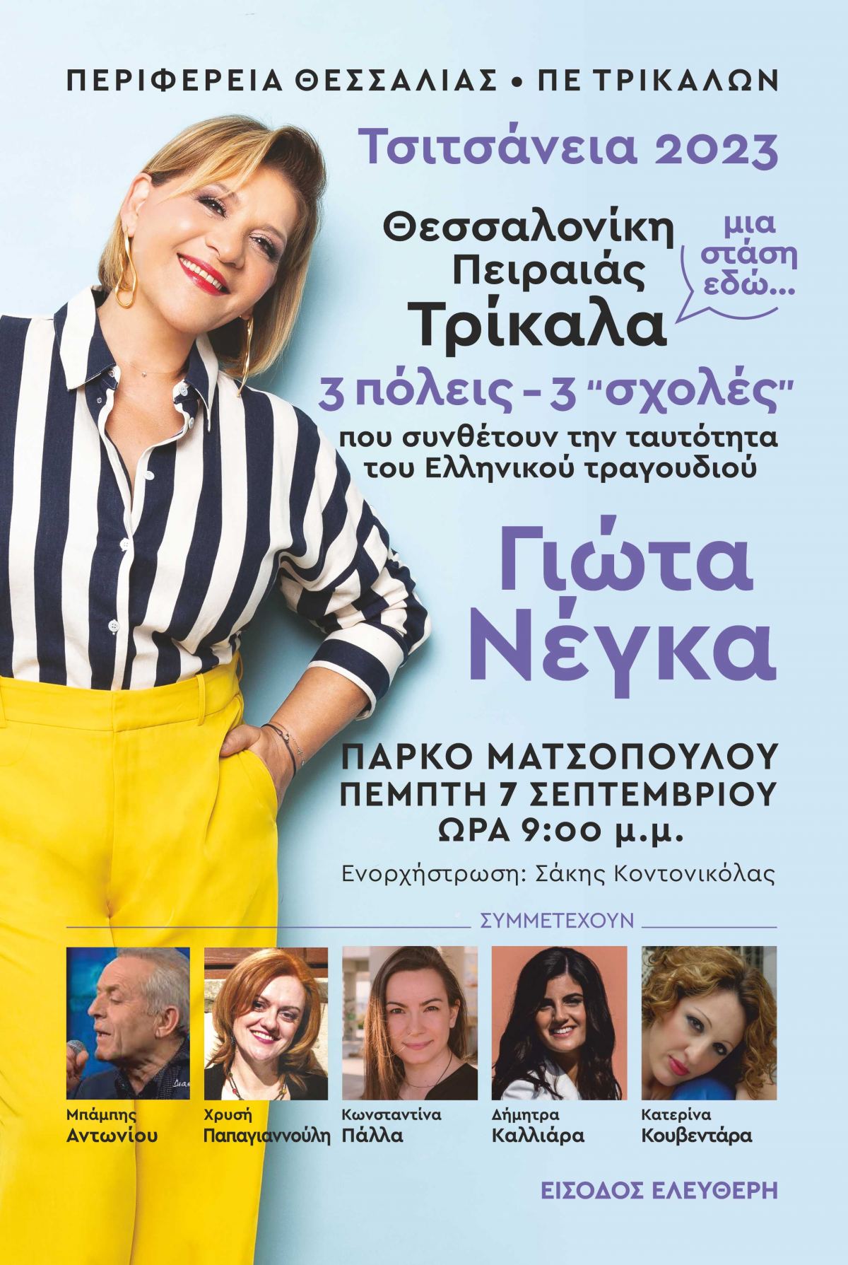 Φιλοξενούμενη της διοργάνωσης και βασική ερμηνεύτρια στα φετινά «Τσιτσάνεια» είναι η Γιώτα Νέγκα, η οποία, με την υπέροχη φωνή της και τη συνοδεία Τρικαλινών ερμηνευτών, θα μας ταξιδέψουν με σύγχρονα έντεχνα, παλιά λαϊκά, αλλά και ρεμπέτικα τραγούδια, σε ένα πρόγραμμα που ενορχήστρωσε και επιμελήθηκε ο Σάκης Κοντονικόλας.