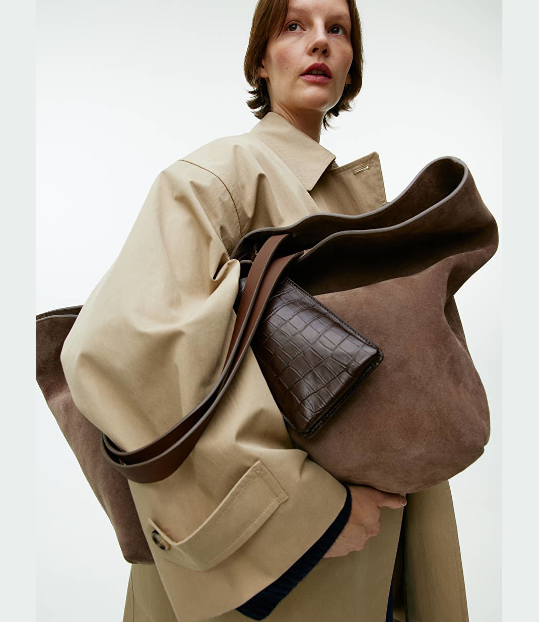 Στη συλλογή των Arket ανακαλύψαμε μια oversized σουέντ tote bag σε γήινη απόχρωση, η οποία σίγουρα θα γίνει το αγαπημένο σας στιλιστικό πασπαρτού, αφού μπορείτε να βάλεις μέσα ό,τι χρειάζεσαι σε καθημερινή βάση, όπως την ατζέντα, το βιβλίο διαβάζετε στο μετρό αλλά και κάποιο σνακ, ενώ είναι τόσο στιλάτη που θα αναβαθμίσει και το ντύσιμό σας.