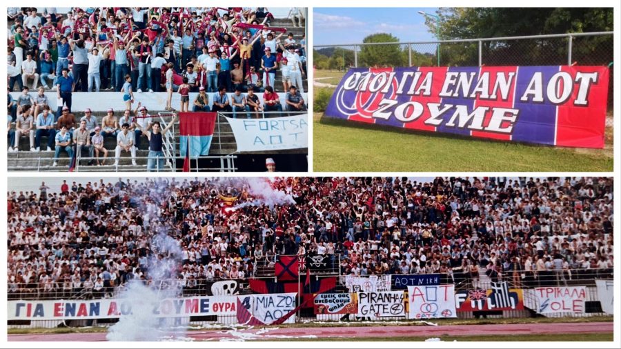 Μετά τον ύμνο της ομάδας ,το πανό με την ρήση ΟΛΟΙ ΓΙΑ ΕΝΑΝ ΑΟΤ ΖΟΥΜΕ αποτελεί ένα διαχρονικό σύμβολο που κρατά ΖΕΣΤΉ την ιδέα του ΑΟ ΤΡΙΚΑΛΑ .Μια και τα παιδιά του συνδέσμου , της σημερινής εποχής εξακολουθούν να το πιστεύουν και να το αναρτούν σκέφτηκα να σας μεταφέρω, σημειολογικά κάποια γεγονότα ….Μάλιστα η γενιά των πενηντάριδων σήμερα στα Τρίκαλα οι περισσόετροι απο αυτούς χωρίς υπερβολή πρέπει να είναι στις δυο φωτογραφίες από το προσωπικό μου αρχείο …..