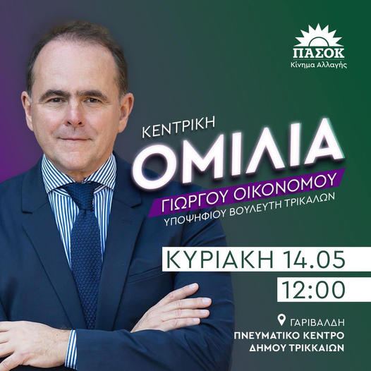Σας προσκαλώ στην κεντρική μου ομιλία, που θα πραγματοποιηθεί την Κυριακή 14 Μαΐου στο Πνευματικό Κέντρο Τρικάλων στις 12:00. Θα ήταν μεγάλη μου τιμή να παραβρεθείτε.