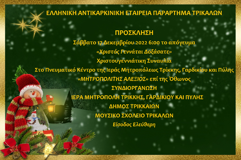 Χριστουγεννιάτικη συναυλία συνδιοργανώνουν, η Ελληνική Αντικαρκινική Εταιρεία – παράρτημα Τρικάλων, η Ι.Μ. Τρίκκης, Γαρδικίου & Πύλης, το Μουσικό Σχολείο Τρικάλων και ο Δήμος Τρικκαίων.
