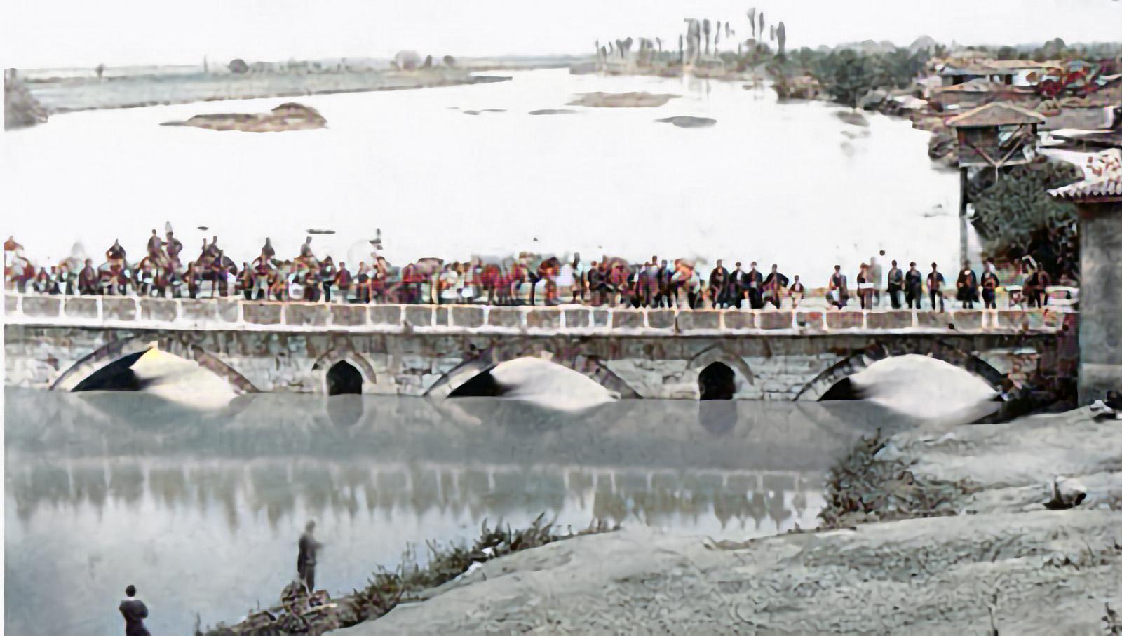 Η γέφυρα του Πηνειού όπως ήταν περίπου το 1883. Φωτογραφία του Δημητρίου Μιχαηλίδη από το φωτογραφικό λεύκωμα «Souvenir de Thessalie». Επιχρωματισμός με τεχνητή νοημοσύνη: onlarissa.gr